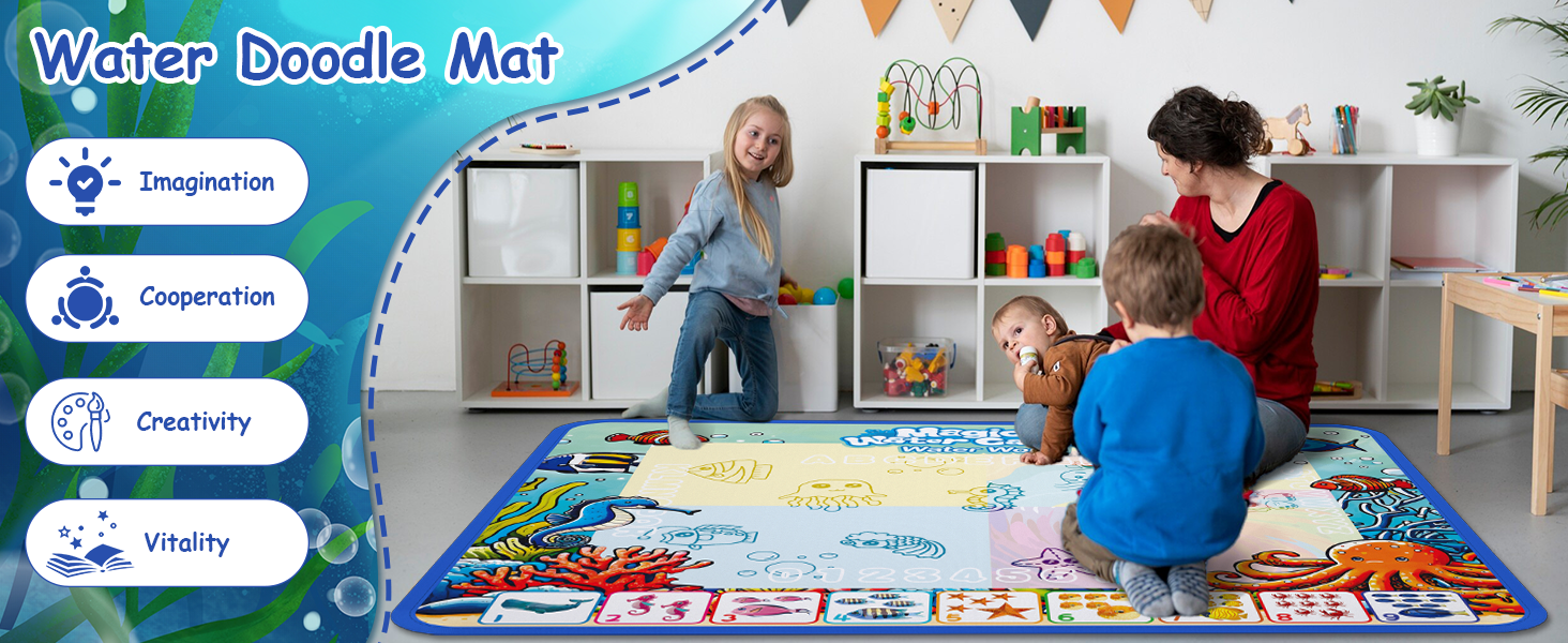 • سجادة رسم المياه: بقياس 40 × 32 بوصة، توفر لعبة بساط الرسم للأطفال مساحة واسعة للعديد من الأطفال للانضمام إلى المرح في وقت واحد. إنها سهلة الاستخدام، وقابلة للطي بسهولة للتخزين المدمج، ومحمولة بشكل مثالي للعب في الأماكن المغلقة أو الهواء الطلق
