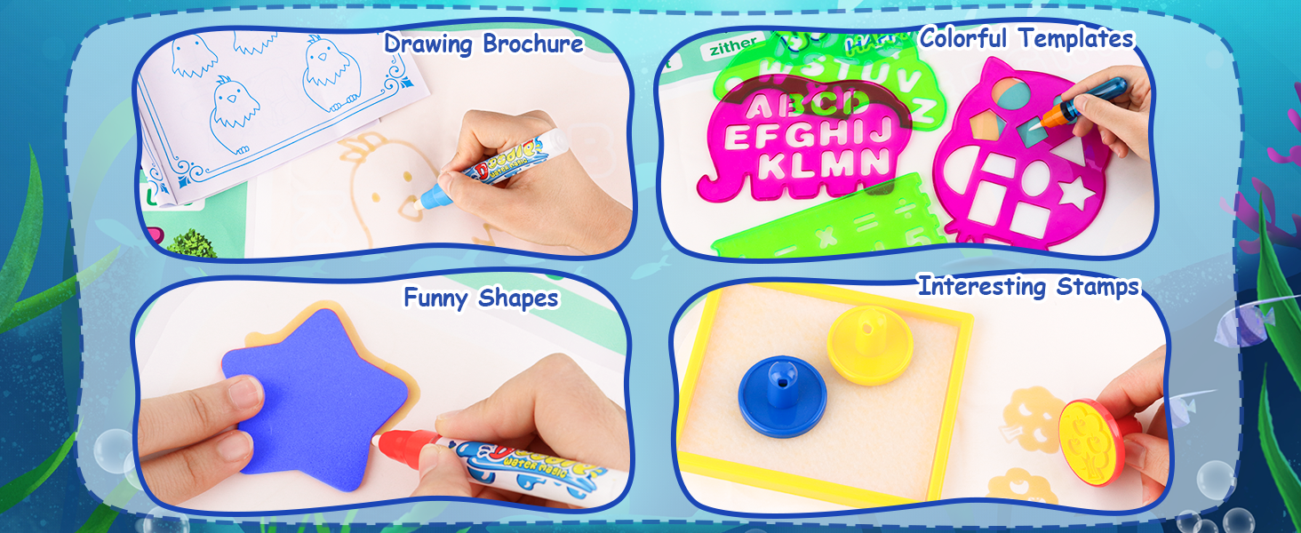 • ترفيه لا نهاية له: تتضمن مجموعة ألعاب الأطفال الصغار المصنوعة من القماش المائي، بالإضافة إلى القماش المائي، أقلام × 6، وقالب رسم × 4، وقالب رسم × 8، وطوابع × 3، وأسطوانة سحرية × 1، وكتيب رسم × 1. المزيد والمزيد من الملحقات المثيرة للاهتمام تجلب لك المزيد من الطرق غير المكتشفة للعب