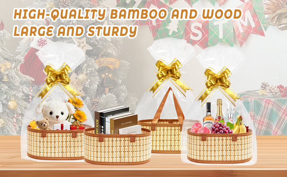 【الخيزران المنسوج يدويًا】كل سلة هدايا منسوجة يدويًا من شرائح الخيزران الطبيعية مع لمسة نهائية ناعمة وخالية من الشظايا. يضمن تصميم القاعدة المعزز أن تظل سلة الهدايا الكبيرة قوية وموثوقة لكل من الهدايا والتخزين.
