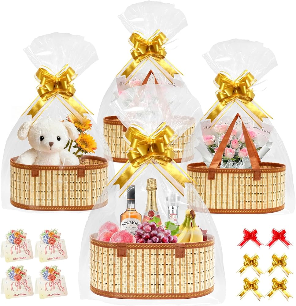 【مجموعة سلة هدايا كبيرة كاملة】تحتوي هذه المجموعة الكبيرة من سلة الهدايا الفارغة الكل في واحد على 4 سلال منسوجة، وأقواس سحب، ولفائف السيلوفان، وبطاقات تهنئة، مما يمنحك كل ما تحتاجه لإنشاء هدية رائعة المظهر في دقائق.
