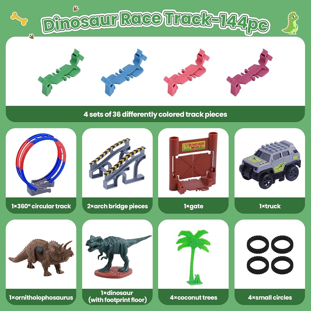 مسارات مجموعة القطارات: تتضمن مجموعة ألعاب الديناصورات هذه 144 قطعة لبناء مسار سباق ديناصور رائع! يحصل الأطفال على مسار سباق مرن، 1 × مسار دائري 360 درجة، 2 × مكونات جسر مقوس، 1 × بوابة، 1 × تيروصور، 1 × ديناصور، 4 × دوائر صغيرة، 1 × أرضية بصمة ديناصور، 4 × أشجار جوز الهند، 4 مجموعات من 36 مكون مسار بألوان متنوعة، 1 × سيارة. بمجرد تجميعها، سيرون عالم المغامرات الجوراسي الملون، مثالي للعب الخيالي وواحد من أفضل الألعاب للأطفال الذين يحبون البناء الإبداعي.