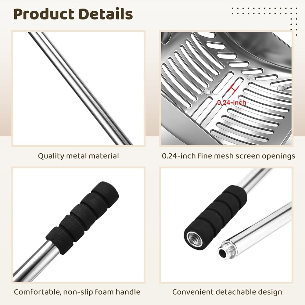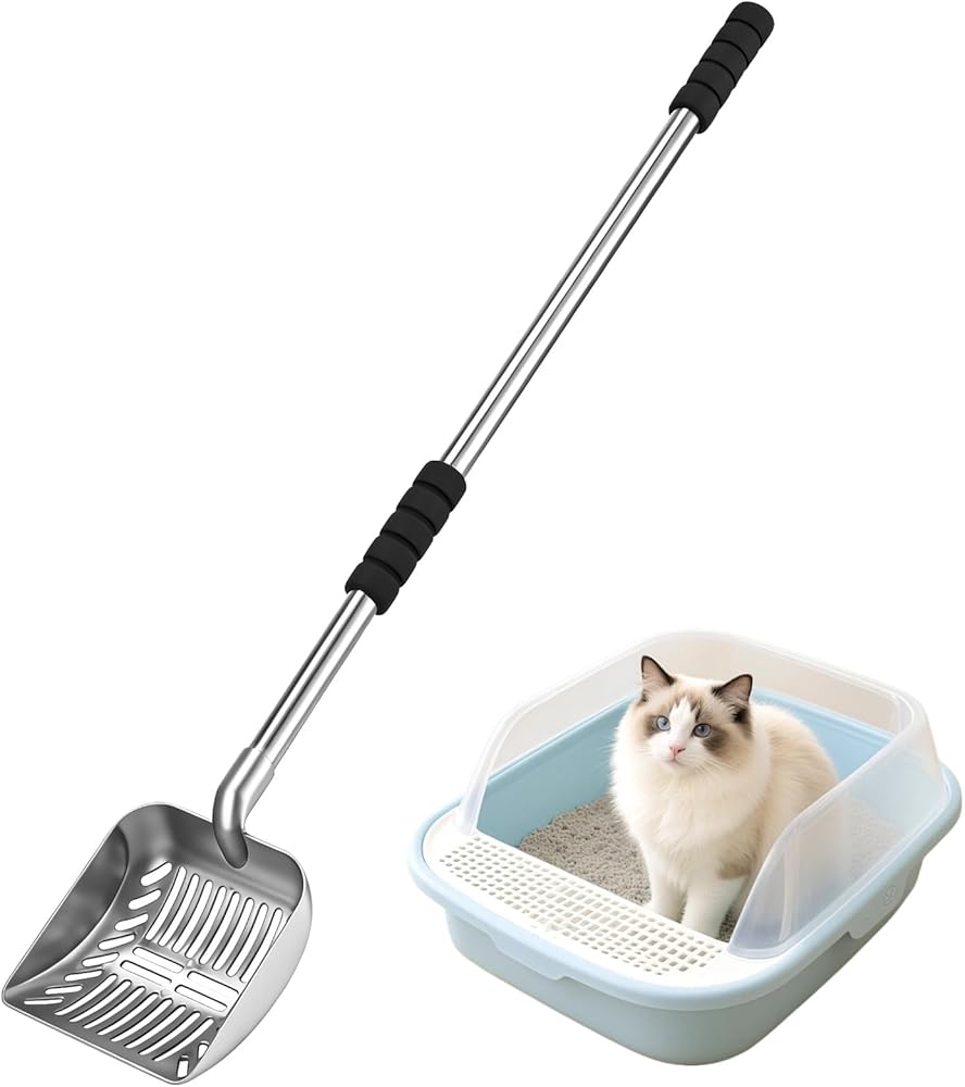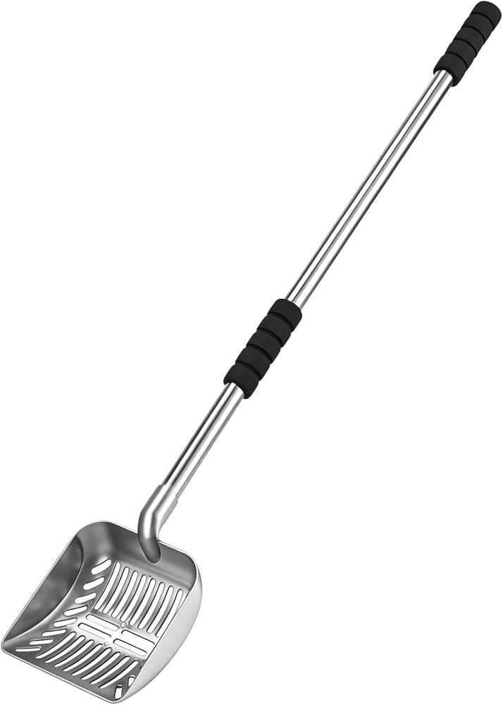 مغرفة فضلات القطط المعدنية، منخل بمقبض طويل 81.28 سم مع شبكة ضيقة 0.24 سم، مغرفة فضلات القطط شديدة التحمل مع قبضة إسفنجية، مجرفة نفايات الحيوانات الأليفة قابلة للفصل، مناسبة للاستخدام في المنزل ومتاجر الحيوانات الأليفة