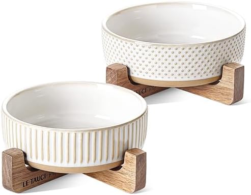 أوعية سيراميك للكلاب من LE TAUCI PET للكلاب الصغيرة والمتوسطة - 4 أكواب متوسطة الحجم من طعام الكلاب ومياه مع حامل خشبي، مجموعة أطباق لطيفة للحيوانات الأليفة مكونة من 2، خطوط + نقاط in Kuwait