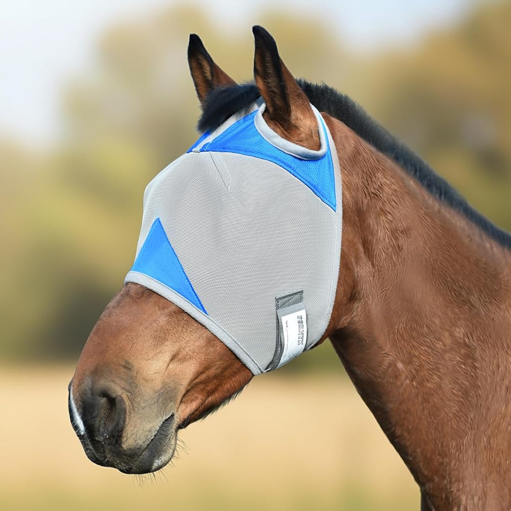 Keep your horse comfortable and protected with the Fornyk high-quality fly mask. Made from tear-resistant micro-mesh, it blocks flies and insects while providing a wide, clear field of vision. The spacious eye area helps reduce rubbing, and the top opening allows the forelock to pass through comfortably. Soft fleece padding around the forehead, nose, and throat ensures gentle contact for all-day wear. With UV shielding, durable materials, and adjustable hook-and-loop straps, this see-through fly mask stays in place during turnout, rolling, or play. The writable name tag simplifies barn organization and adds a personal touch. Lightweight, breathable, and easy to clean, it's designed for long-lasting use in both turnout and training. A practical, reliable choice for riders and horse owners seeking everyday comfort and protection for their horses