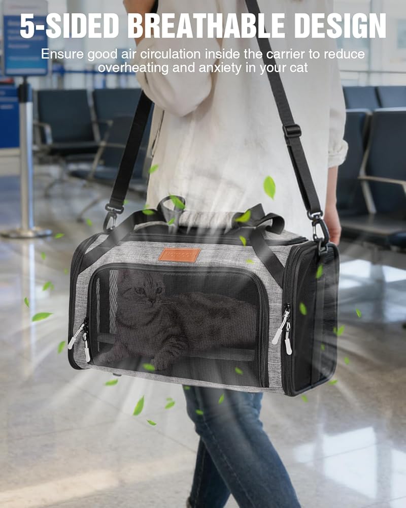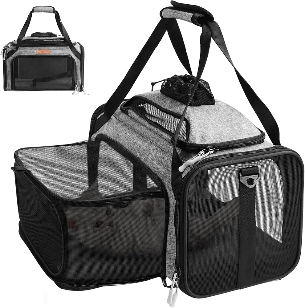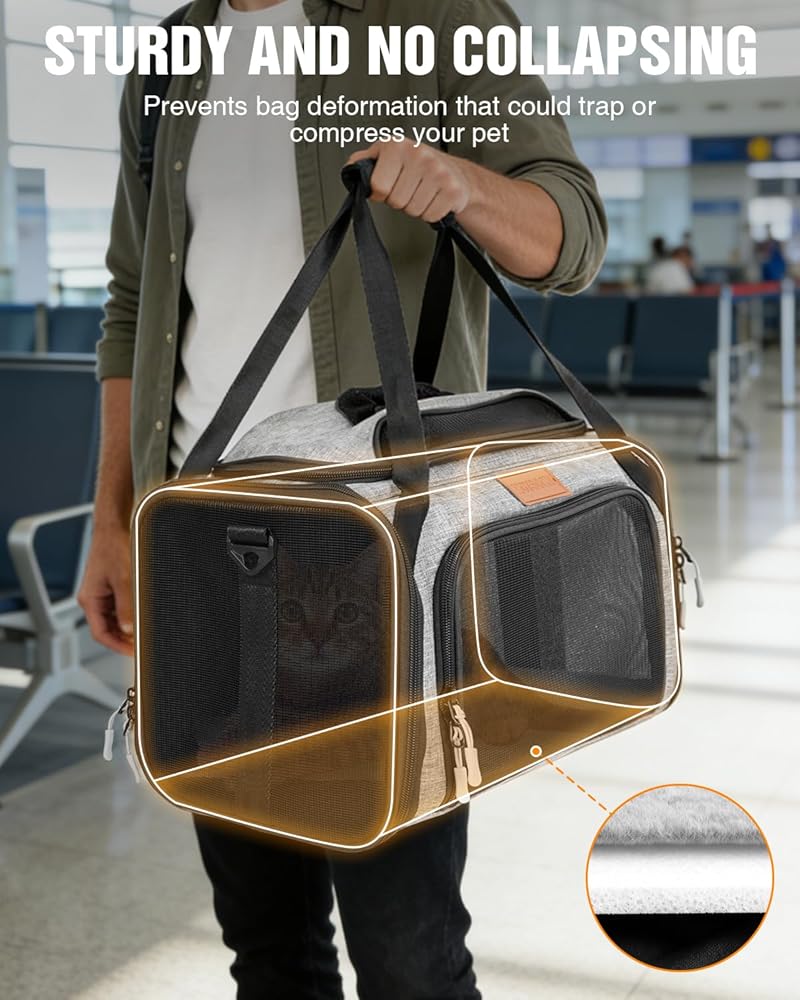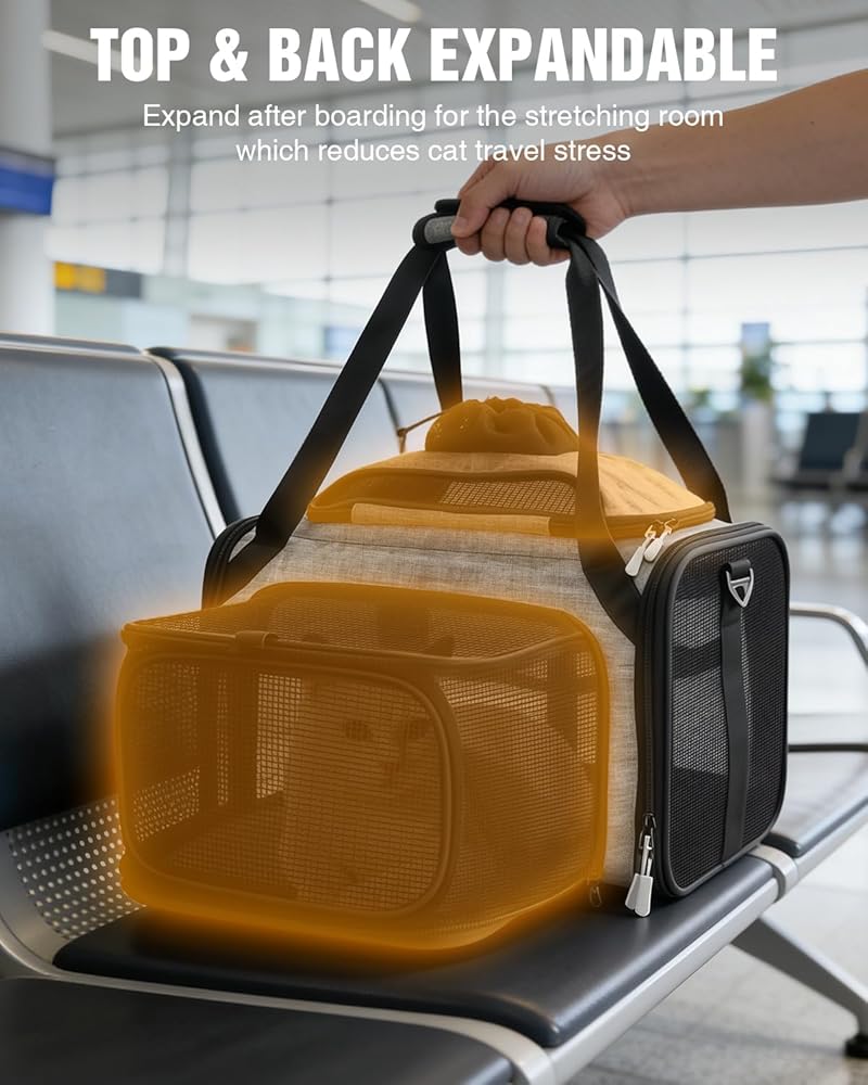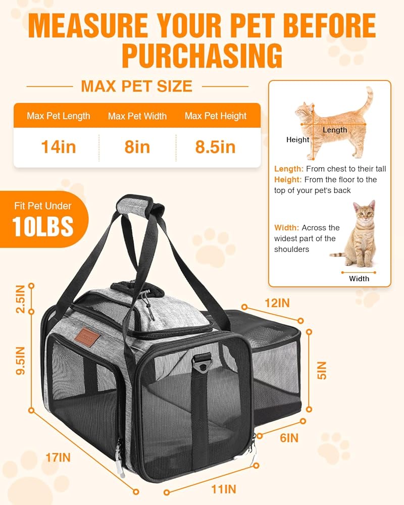 تصميم قابل للتوسيع لمزيد من المساحة والراحة: مناسب تمامًا للحيوانات الأليفة التي يبلغ طول ظهرها 15 بوصة وارتفاعها 8.5 بوصة. تتميز حاملة القطط ذات الجوانب الناعمة بألواح علوية وجانبية قابلة للتوسيع تمنح قطتك مساحة إضافية للتمدد والدوران أثناء الرحلات الجوية الطويلة أو القيادة. مثالية للقطط الصغيرة التي يصل وزنها إلى 11 رطلاً، فهي تساعد على تقليل إجهاد السفر وتحافظ على هدوء وراحة الحيوانات الأليفة في مساحات الطيران الضيقة.