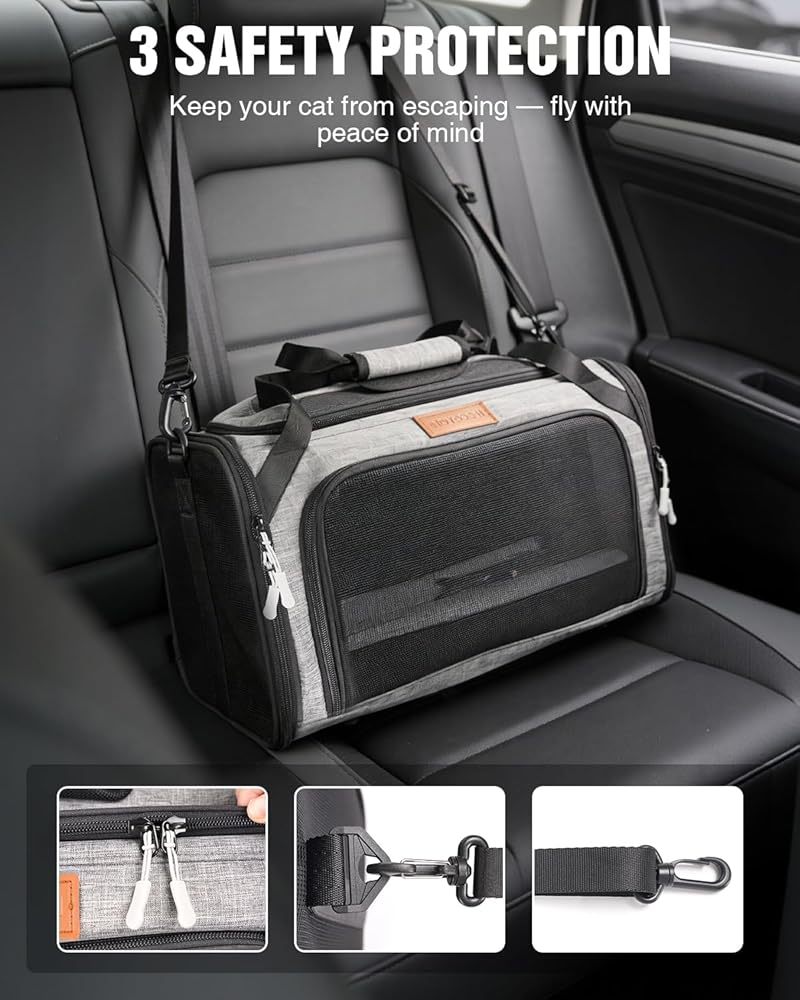 ميزات أمان ثلاثية تضمن راحة البال أثناء السفر: 1. تحتوي حاملة القطط من بيتوكس على مقود أمان مدمج لتأمين قطتك على الحزام ومنعها من الهروب في مواقف التخييم؛ 2. يُغلق السحاب ذاتي الغلق بشكل آمن ولن يتم فتحه عن طريق الخطأ بواسطة قطتك أثناء السفر في السيارة؛ 3. تمنع الشبكة المتينة المضادة للخدش خدوش القطط بشكل فعال مع الحفاظ على تدفق الهواء في البيئات المغلقة