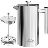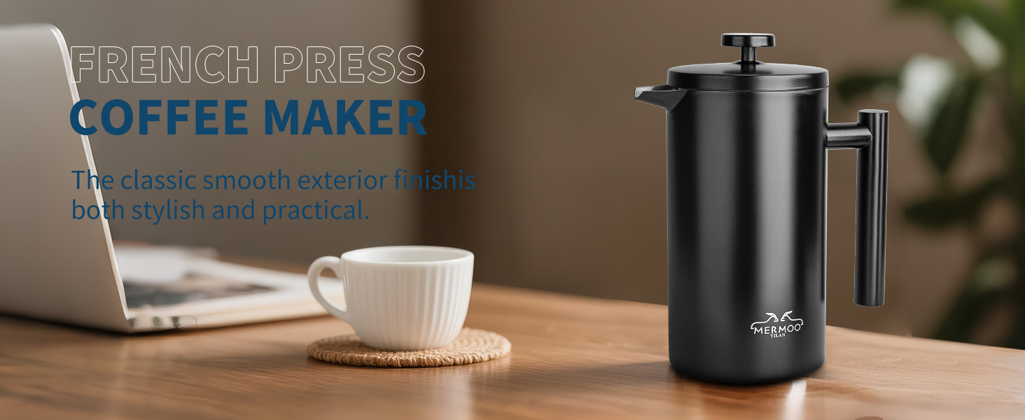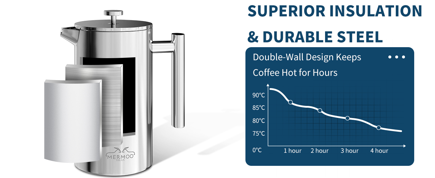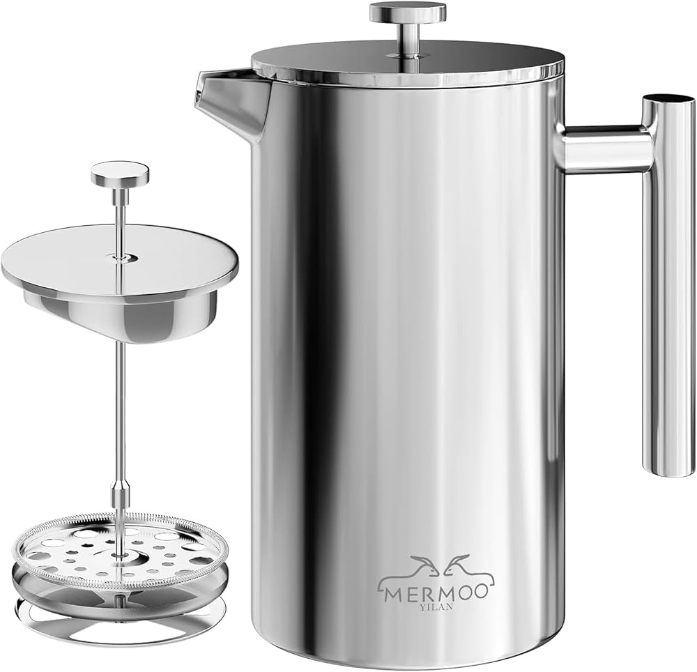 [عصارة قهوة من الفولاذ المقاوم للصدأ بجدار مزدوج] عصارة القهوة الفرنسية MERMOO YILAN مصنوعة من الفولاذ المقاوم للصدأ 304، وهو متين ومقاوم للصدأ وسهل التنظيف. ماكينة صنع القهوة آمنة للاستخدام في غسالة الأطباق. تتميز هذه الصحافة الفرنسية الكبيرة بعزل مزدوج الجدران، وتحافظ على درجة حرارة قهوتك لساعات