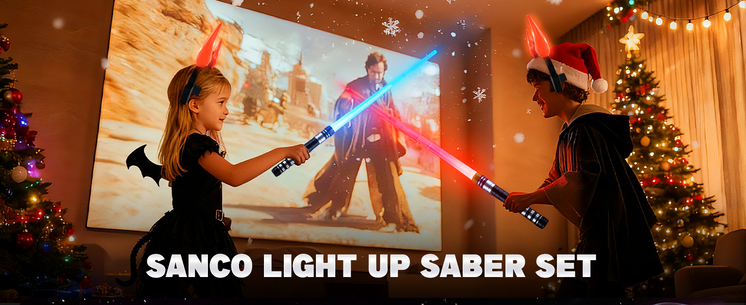 مجموعة سانكو لايت أب سيبر للأطفال - 4 عبوات من 7 ألوان سيوف قوية قابلة للسحب مع قطعتين من عباءات سوداء وعصابات رأس قرون الشيطان المتوهجة، ديكور الحفلات التنكرية، هدايا عيد الميلاد للأولاد والبنات
