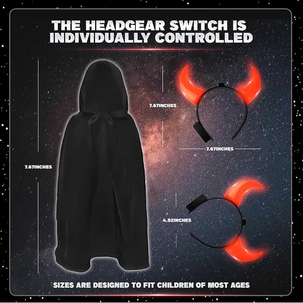 مجموعة الأزياء النهائية 4 في 1: تتضمن 4 عبوات من 7 سيوف مضيئة قابلة للسحب مع صوت FX، وعبوتين من عباءات سوداء، وعبوتين من عصابات الرأس المتوهجة من قرون الشيطان للعب فوري وكامل للشخصية.