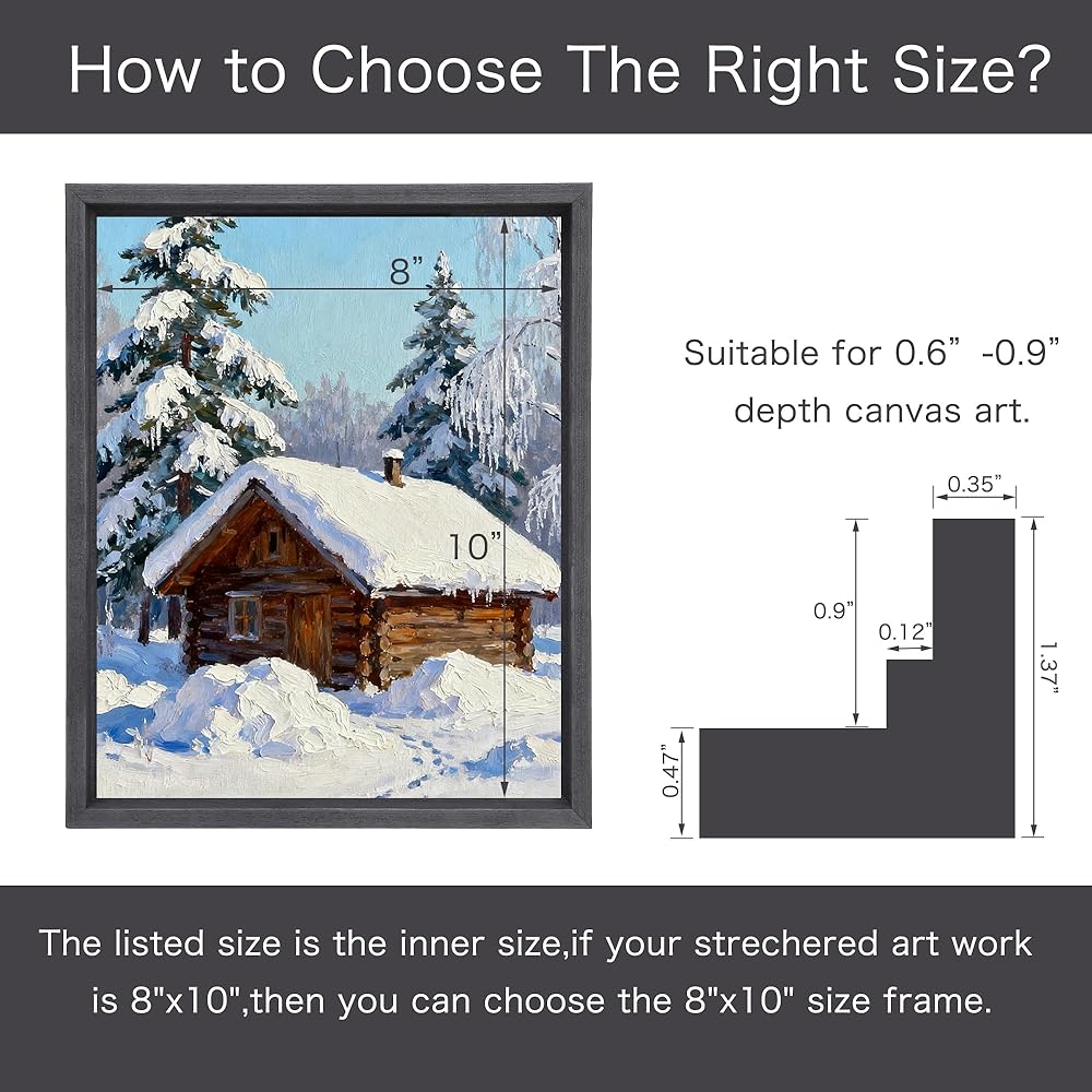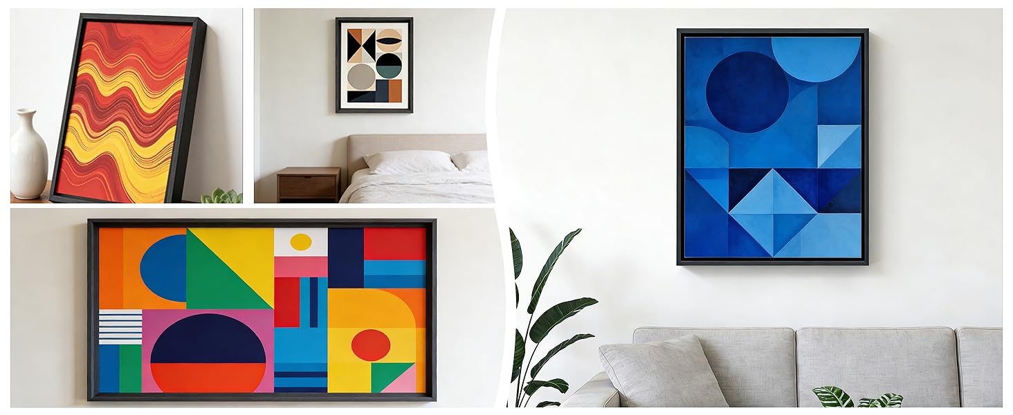 • مقاسات متعددة للوحات القماشية العميقة: مصممة لتناسب الأعمال الفنية القماشية بأعماق تتراوح من 0.6 بوصة إلى 0.9 بوصة، ويناسب إطار القماش الخاص بنا معظم اللوحات القماشية القياسية. يضمن تصميمه تأثيرًا عائمًا، مما يجعله مثاليًا للفنانين ومصممي ديكور المنزل.