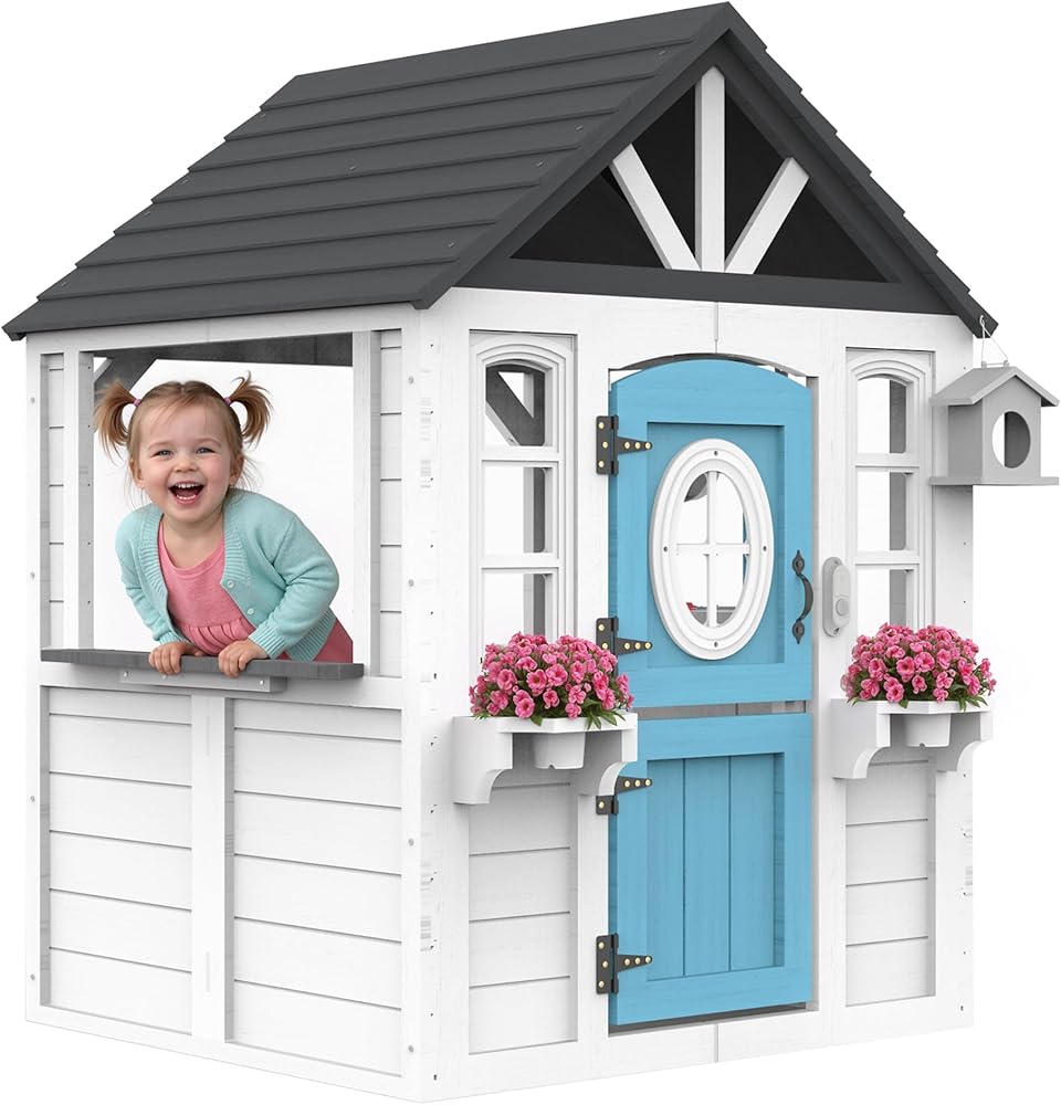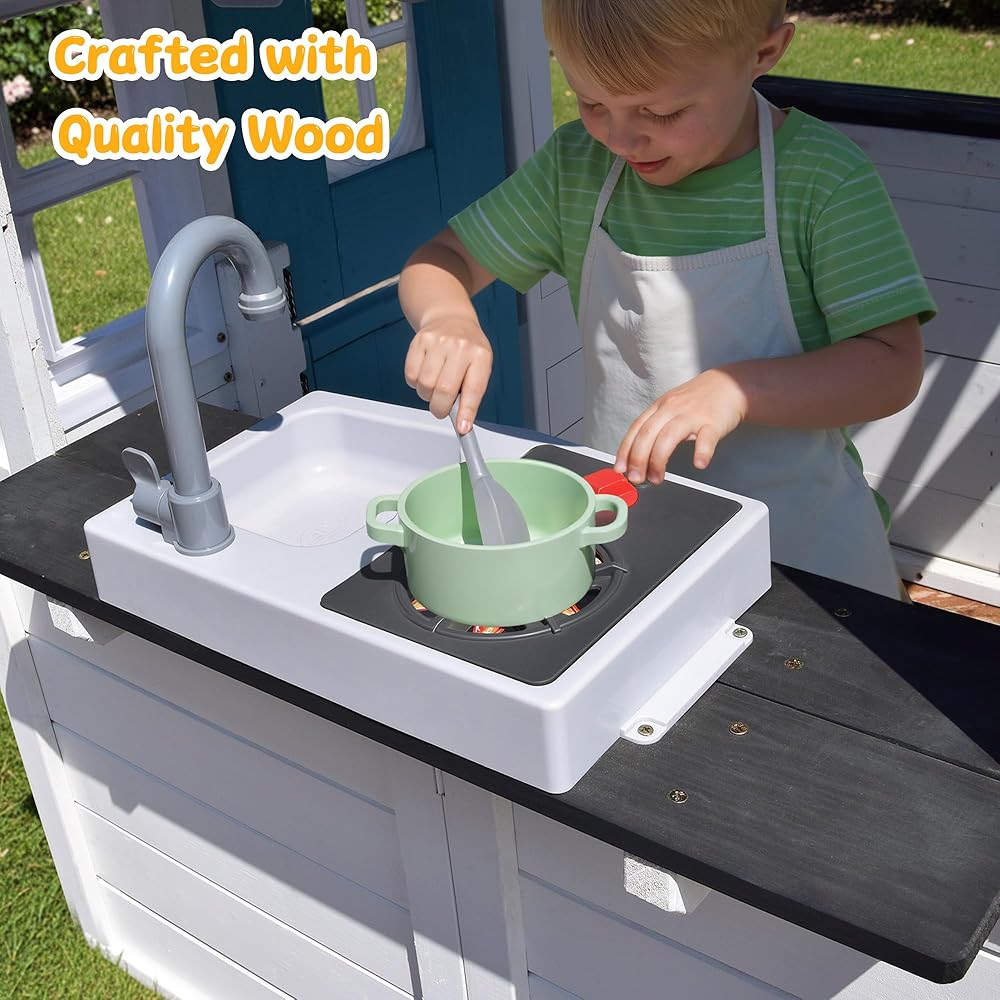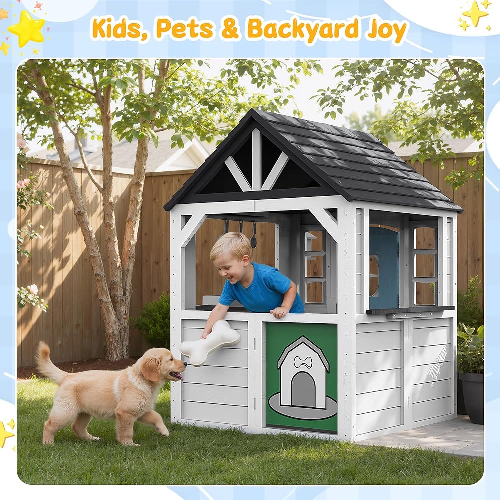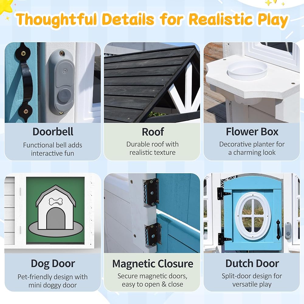 بيت لعب خشبي للأطفال مع حوض مطبخ وصندوق بريد وجرس باب للعمل، وبيت لعب للأطفال في الهواء الطلق مع باب هولندي وباب للكلاب وملحقات للفناء الخلفي وسوق التظاهر ومتعة العطلات