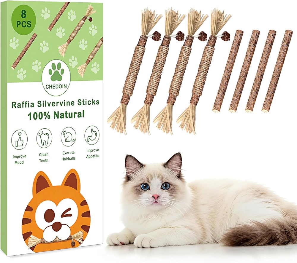 متعة لا تقاوم للقطط: إن أعواد الكرمة الفضية الخاصة بنا للقطط وفاكهة المر غنية بالأكتينيدين والنيبيتالاكتون - وهي مركبات طبيعية تؤدي إلى استجابة مرحة. باعتبارها ألعابًا ممتازة للقطط، تعمل هذه العصي الثمانية على تخفيف التوتر، وتشجع على ممارسة التمارين، وهي ألعاب مثالية لإثراء القطط وبديل رائع للعبة النعناع البري.