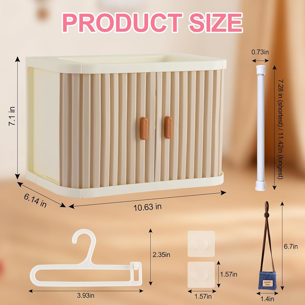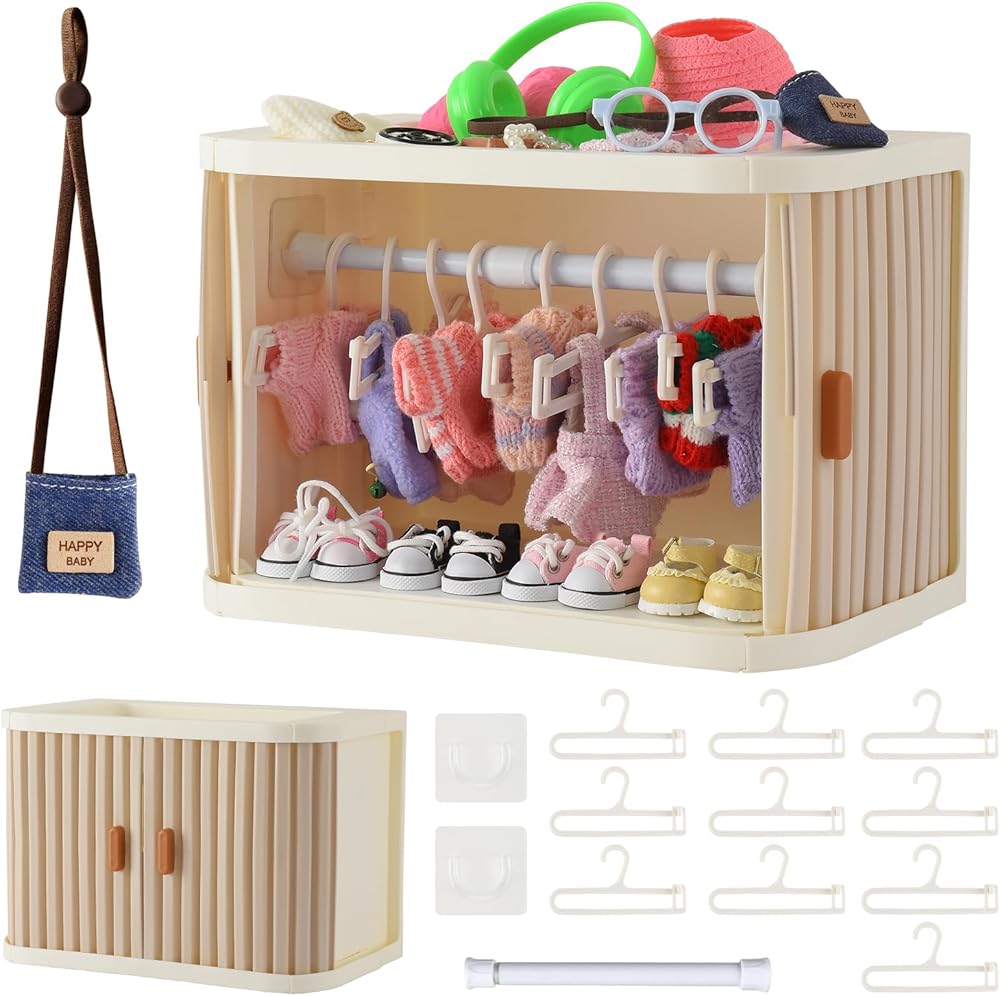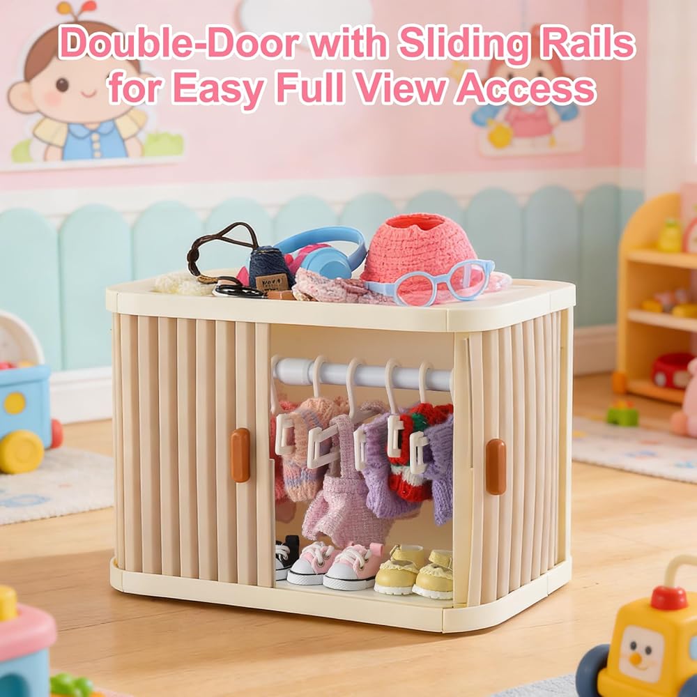 【مجموعة العرض والتخزين الشاملة كليًا】 هذه ليست مجرد حاوية تخزين - إنها حل عرض متكامل تمامًا مصمم خصيصًا لدميتك الثمينة. تأتي المجموعة كاملة مع خزانة ملابس واسعة، و10 علاقات غير قابلة للانزلاق، وقضيب تعليق قابل للإزالة، مما يرفع على الفور كيفية عرض مجموعتك.