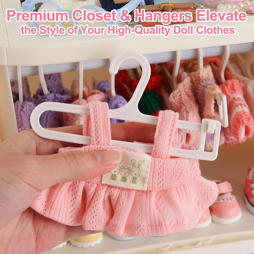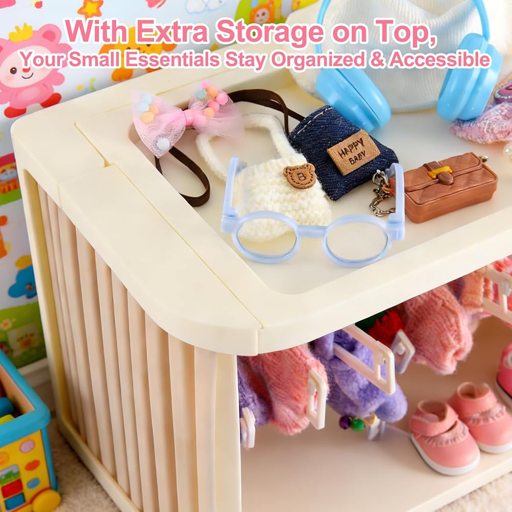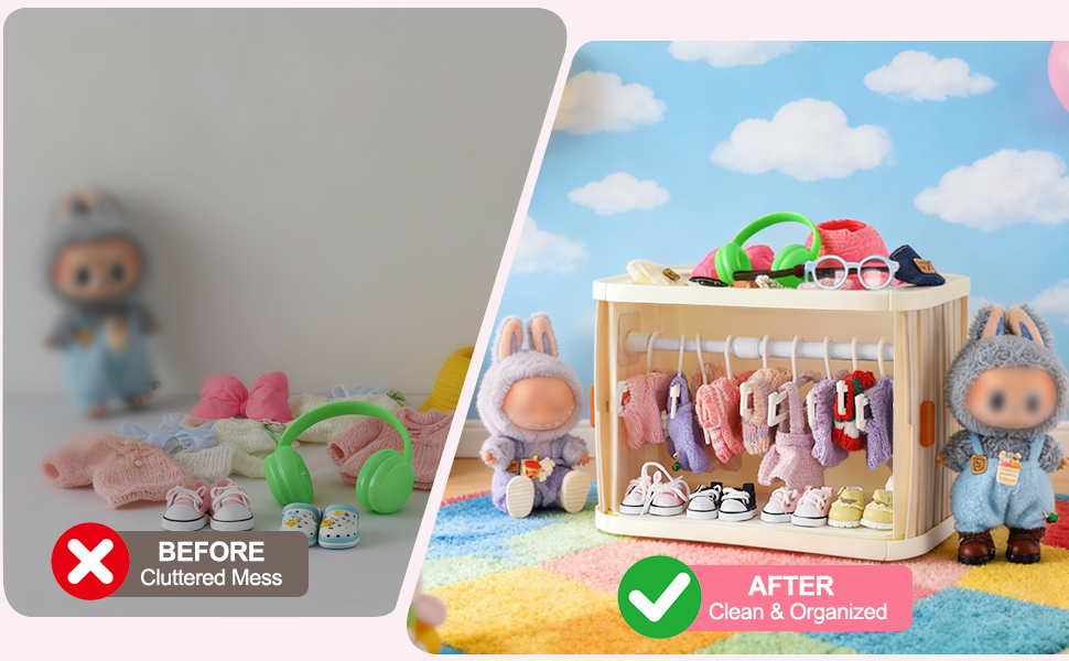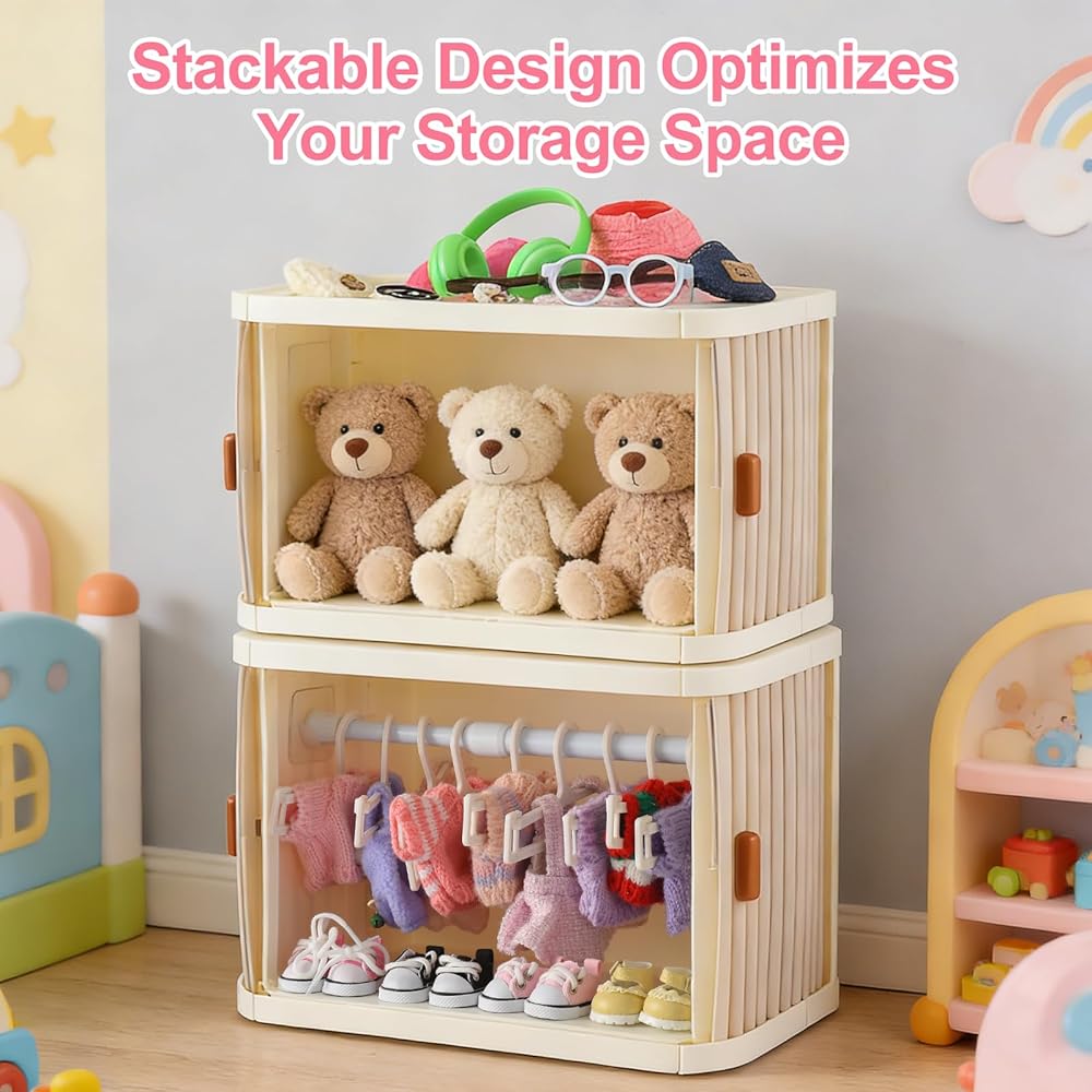 【مجموعة العرض والتخزين الشاملة كليًا】 هذه ليست مجرد حاوية تخزين - إنها حل عرض متكامل تمامًا مصمم خصيصًا لدميتك الثمينة. تأتي المجموعة كاملة مع خزانة ملابس واسعة، و10 علاقات غير قابلة للانزلاق، وقضيب تعليق قابل للإزالة، مما يرفع على الفور كيفية عرض مجموعتك.