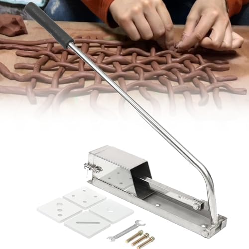This stainless steel clay extruder is designed for pottery and ceramics making, featuring a wall-mounted design for stability and ease of use. Equipped with 4 ceramic molds, it allows you to create various shapes using soft clay or slip, making it ideal for art projects and educational activities.
