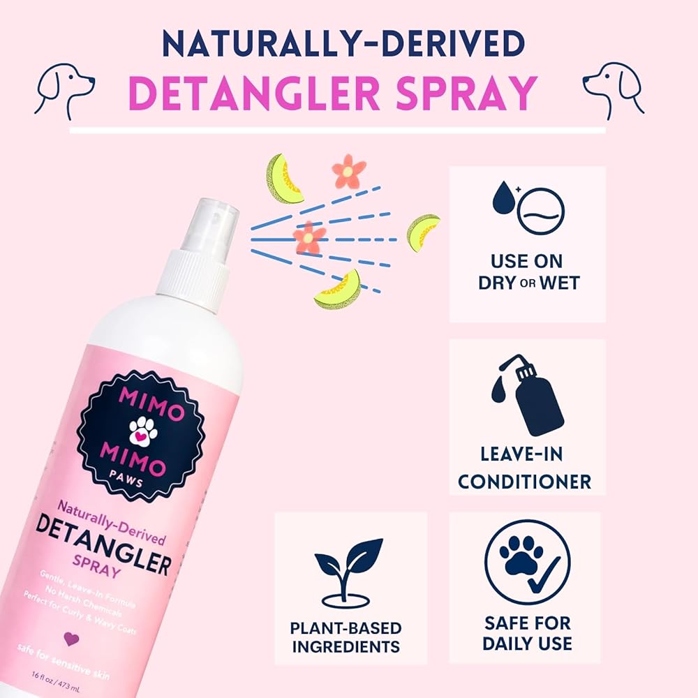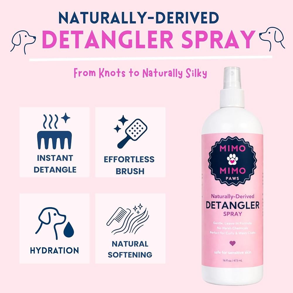 Say goodbye to tangles and knots with MIMO MIMO PAWS Naturally-Derived Pet Detangler Spray — the ultimate solution for soft, silky, and manageable coats. This gentle, leave-in formula instantly detangles while hydrating with lightweight, plant-based moisture. Enriched with naturally derived ingredients, it leaves every coat smooth, shiny, and easy to brush without sticky residue. Perfect for dogs and cats over 12 weeks old, this detangler can be used on wet or dry fur to make grooming simple and stress-free. Formulated without sulfates, phosphates, or parabens, it's safe for sensitive skin and designed to enhance your pet's natural beauty. Made in the USA — where Care is Made Simple and Beauty Made Perfect.