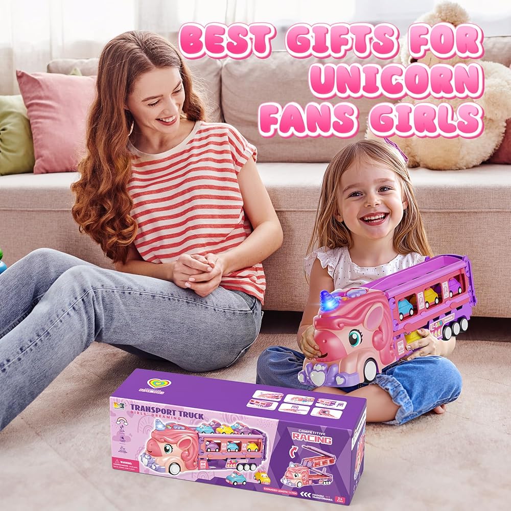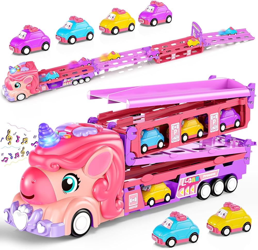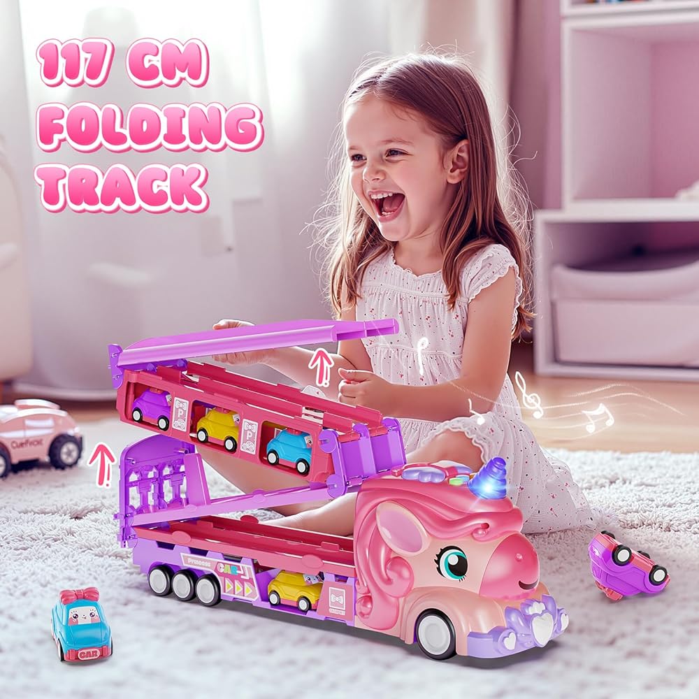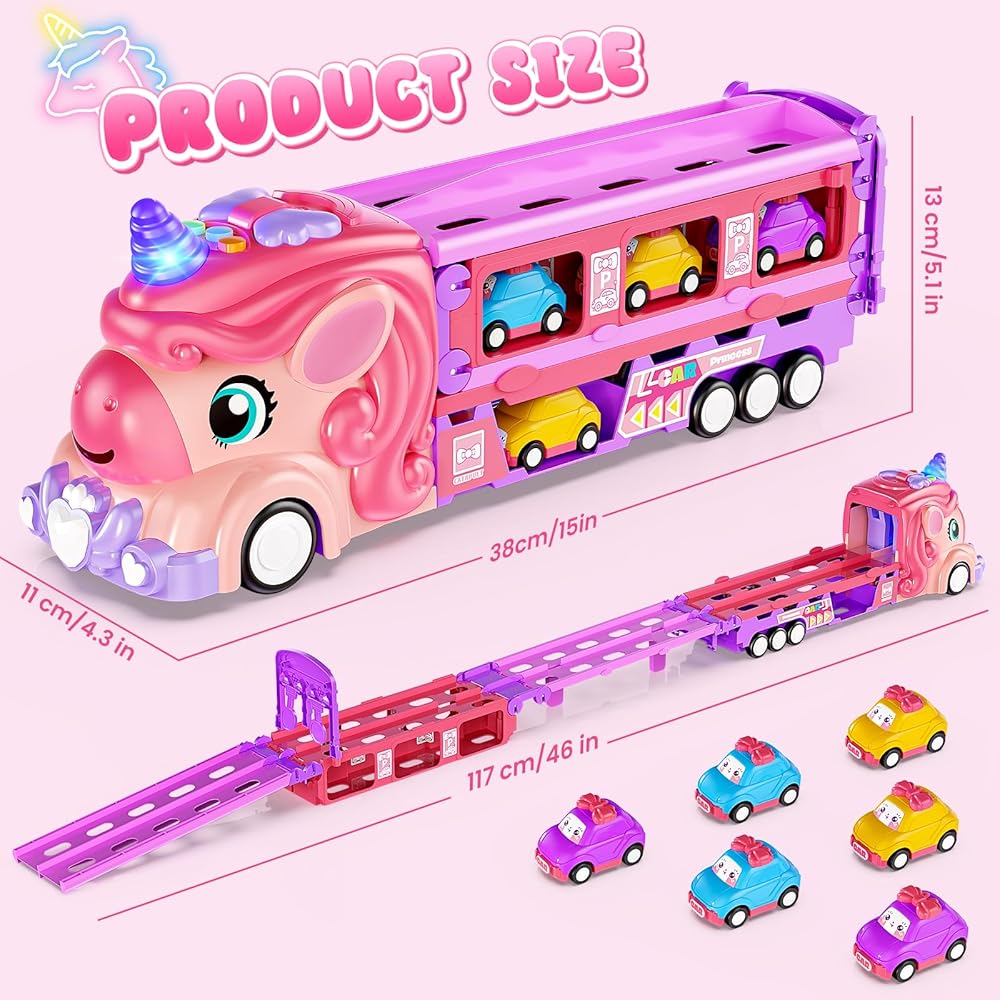 • متعة يونيكورن 2 في 1 لفتياتك: شاهد شاحنتنا السحرية يونيكورن تتحول إلى مسار سباق مثير بمسارين 46 بوصة! اضغط على زر الإطلاق لطفلين للسباق في وقت واحد، مما يعزز المنافسة الودية وساعات من المرح التعاوني والتفاعلي مع الأضواء والأصوات. تتضمن 6 سيارات صغيرة بطابع الأميرة للعب خيالي لا نهاية له. مثالية للفتيات من سن 2 إلى 7 سنوات.