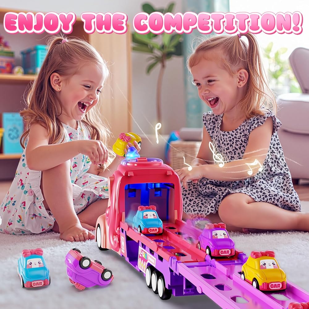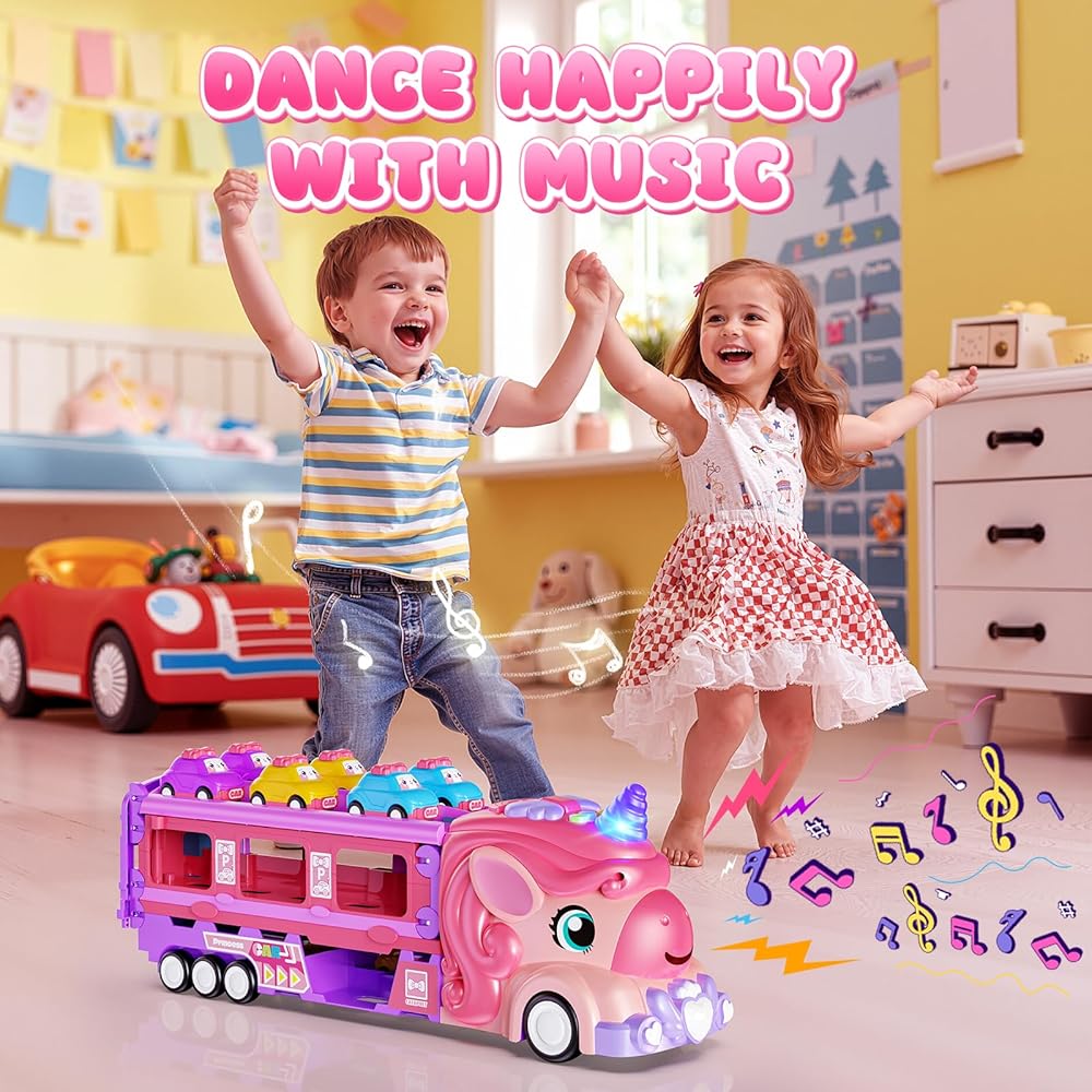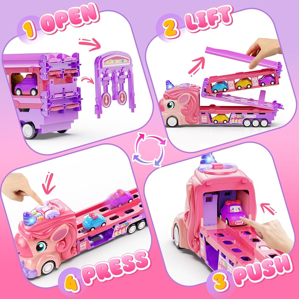 • متعة يونيكورن 2 في 1 لفتياتك: شاهد شاحنتنا السحرية يونيكورن تتحول إلى مسار سباق مثير بمسارين 46 بوصة! اضغط على زر الإطلاق لطفلين للسباق في وقت واحد، مما يعزز المنافسة الودية وساعات من المرح التعاوني والتفاعلي مع الأضواء والأصوات. تتضمن 6 سيارات صغيرة بطابع الأميرة للعب خيالي لا نهاية له. مثالية للفتيات من سن 2 إلى 7 سنوات.