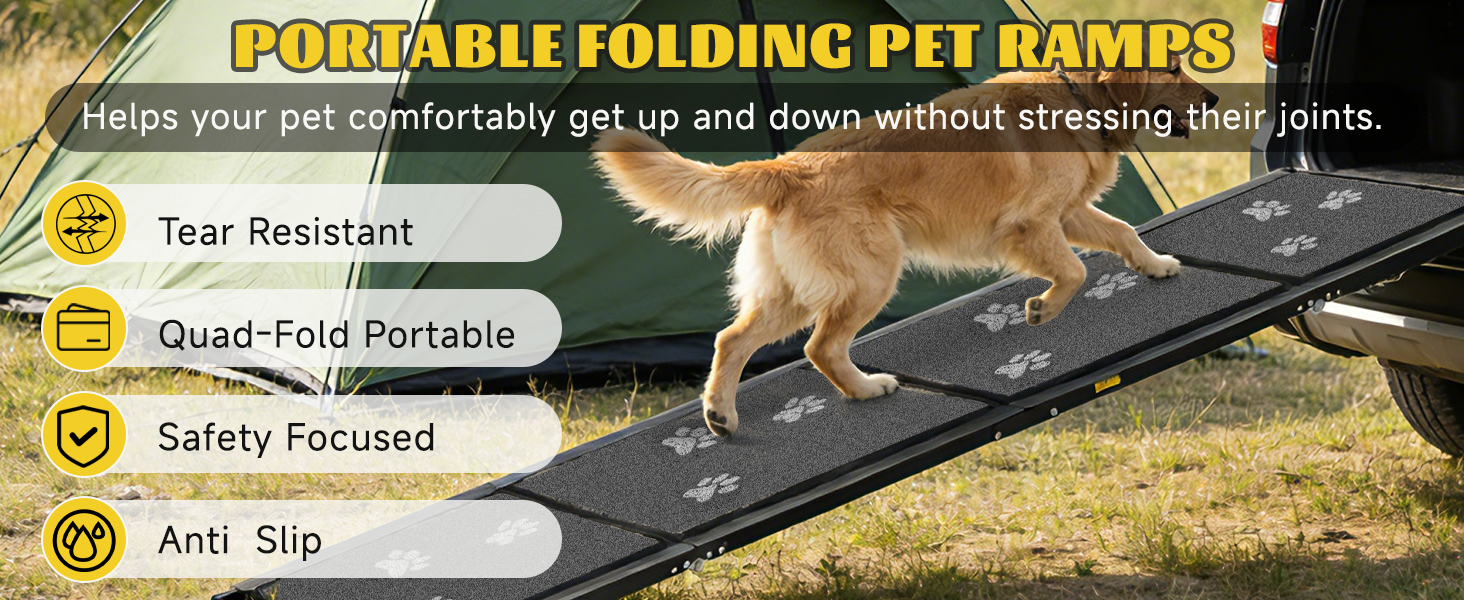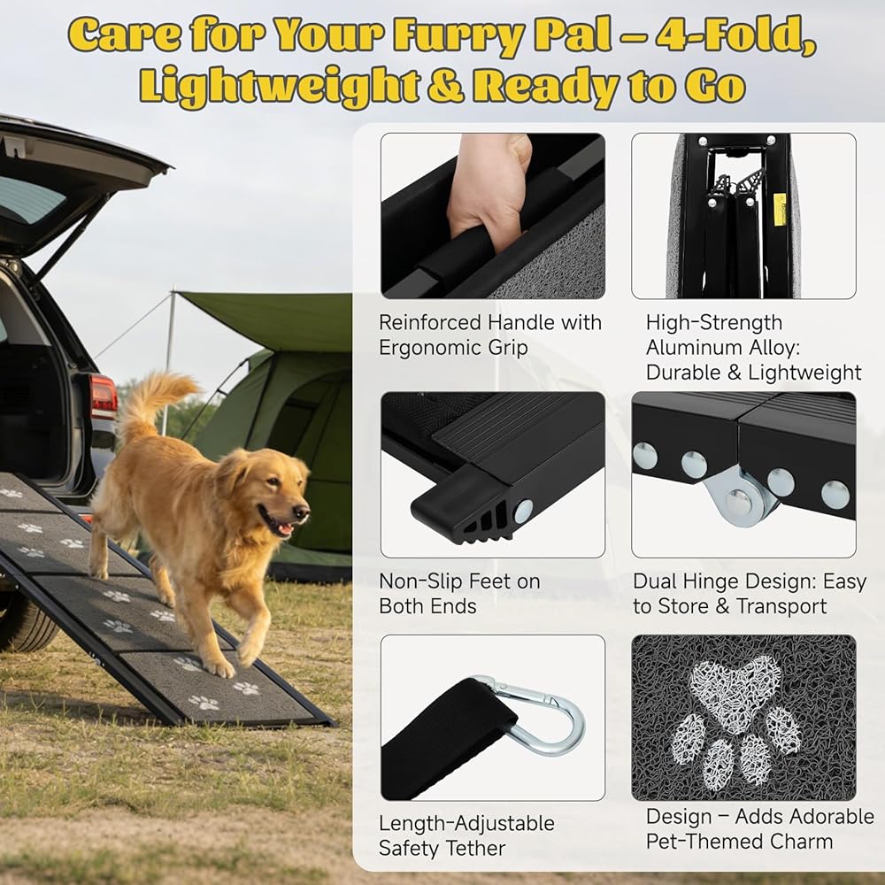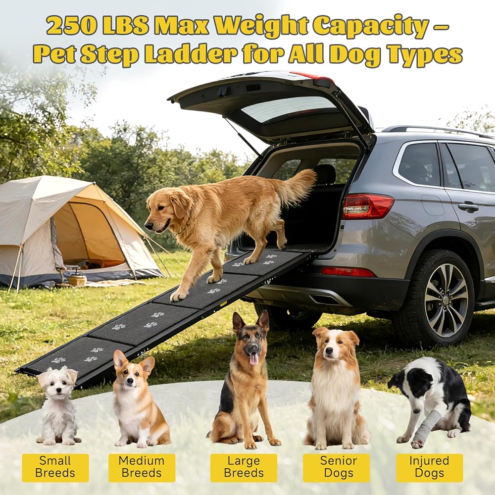 منحدر سيارة قوي ومستقر للكلاب - منحدر الكلاب للسيارة مصنوع من الألومنيوم الفاخر، سلالم قابلة للطي للكلاب تضمن هيكلًا خفيف الوزن ولكنه قوي يمكنه حمل ما يصل إلى 250 رطلاً. توفر عوارض الدعم المبتكرة ثباتًا دائمًا، مما يجعلها مثالية للكلاب الكبيرة والمتوسطة والصغيرة للوصول بسهولة إلى سيارتك أو سيارات الدفع الرباعي أو الشاحنة أو الأريكة أو السرير المرتفع.