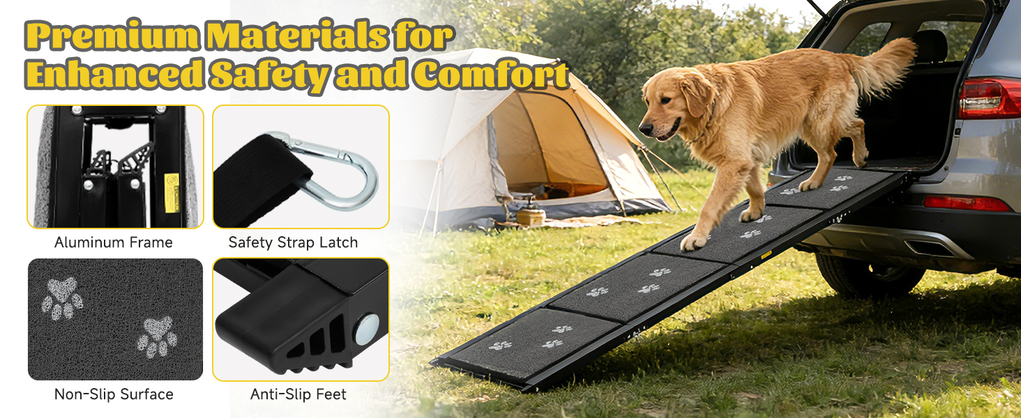 طول ممتد من أجل الراحة - يضمن مسند الكلاب الذي يبلغ طوله 63 بوصة للسيارة انحدارًا لطيفًا يقلل من الضغط على عضلات ومفاصل حيوانك الأليف. مثالية للكلاب الكبيرة أو المصابة أو ذات الأرجل القصيرة. بالإضافة إلى ذلك، يبلغ عرضه 43.18 سم، وهو واسع بما يكفي للحفاظ على أمان حيوانك الأليف أثناء صعوده. يشتمل على حبال أمان وإبزيم من الفولاذ المقاوم للصدأ لمزيد من راحة البال!
