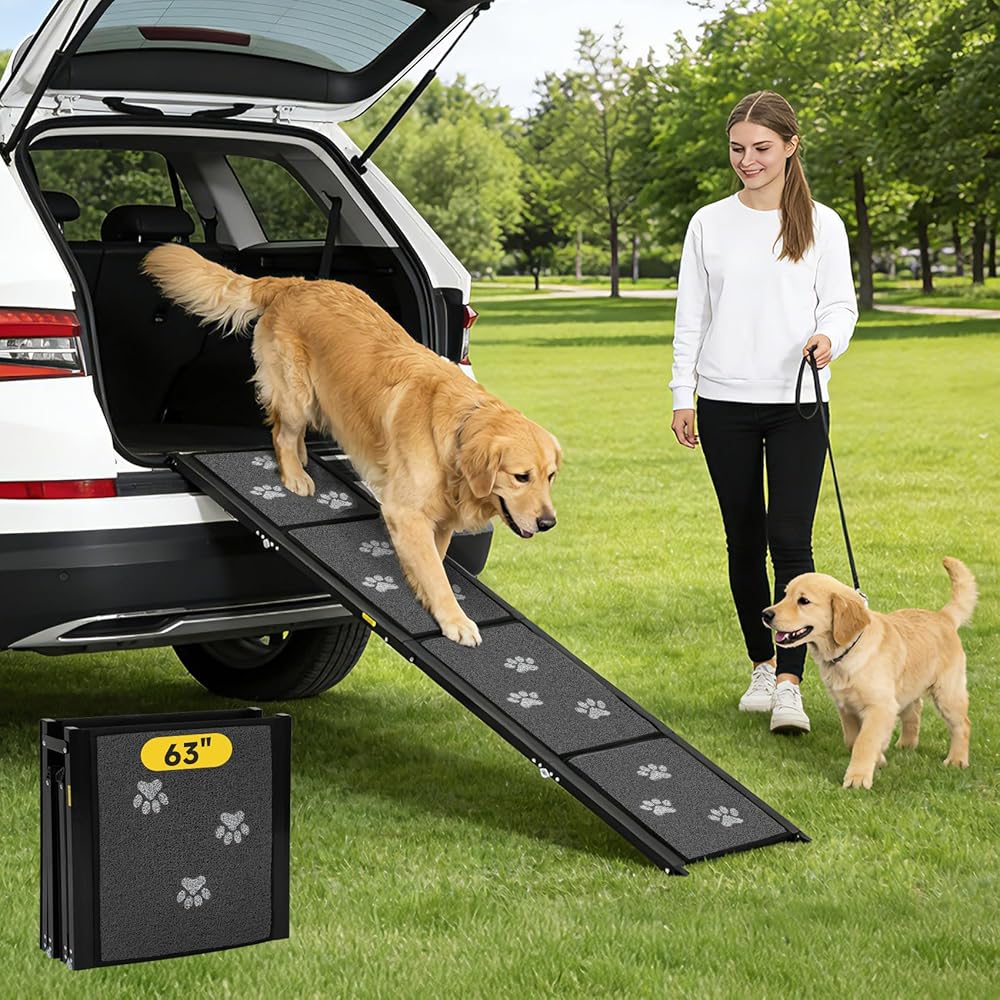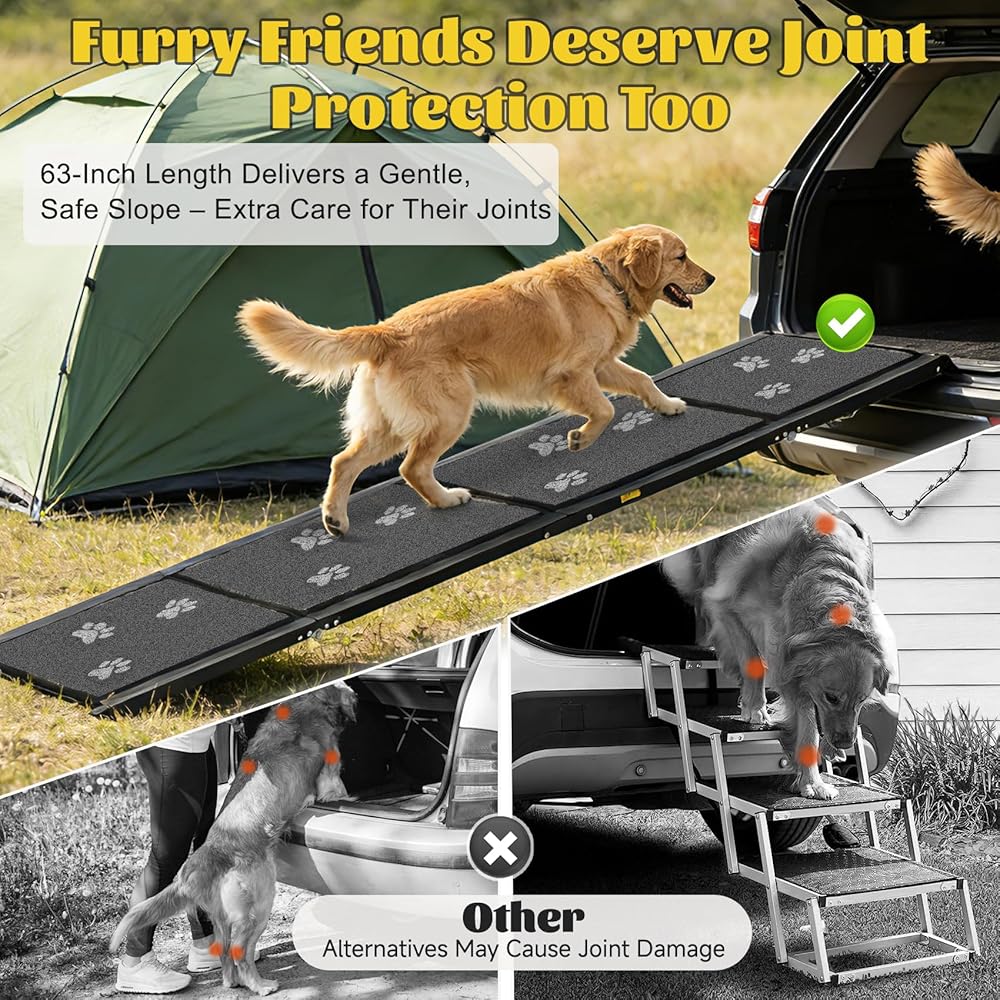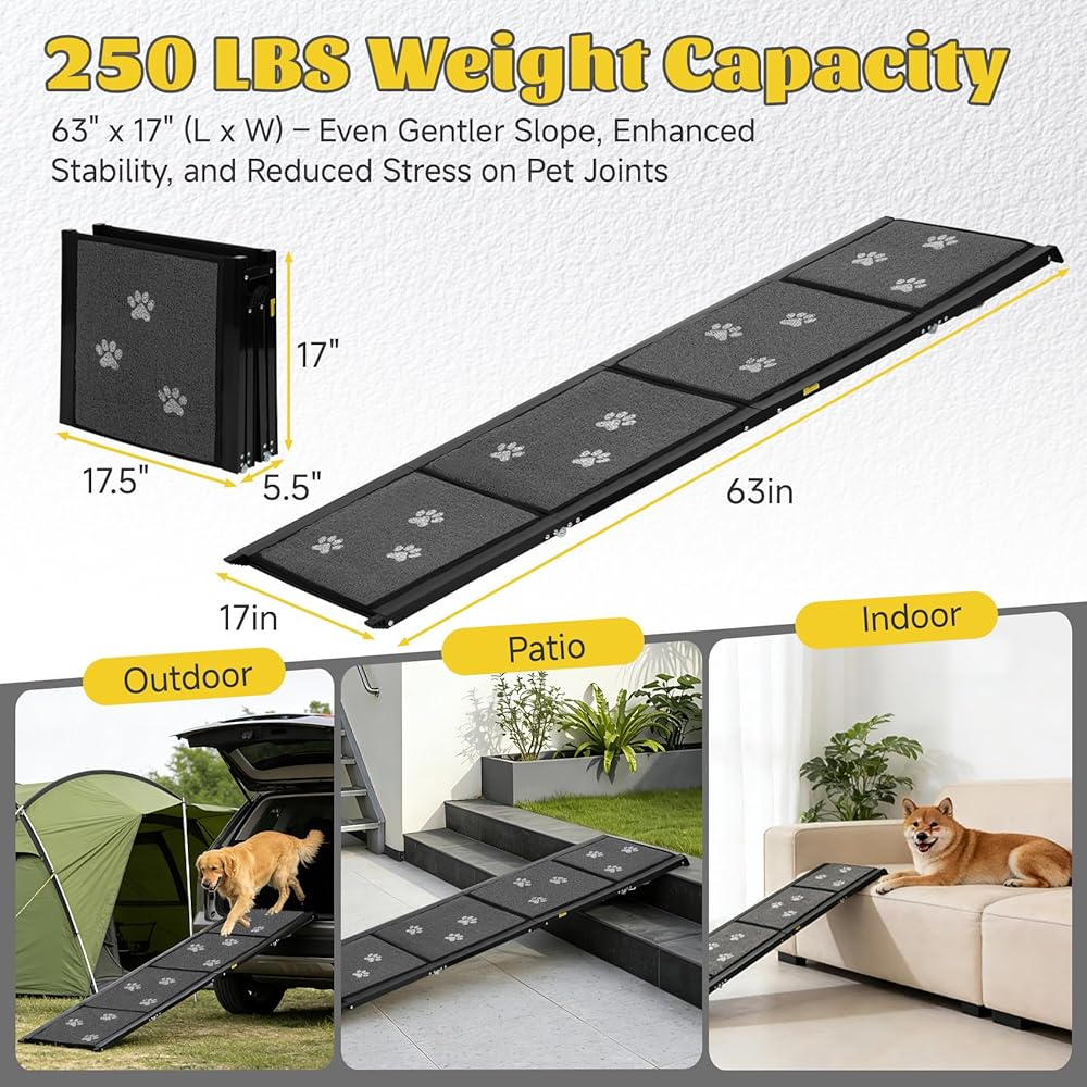 منحدر للكلاب للسيارة بطول 63 بوصة و17 بوصة منحدرات محمولة للكلاب الكبيرة سطح سجادة غير قابلة للانزلاق وخطوات واسعة للغاية لسيارة الدفع الرباعي والشاحنات منحدر للكلاب قابل للطي يدعم ما يصل إلى 250 رطلاً