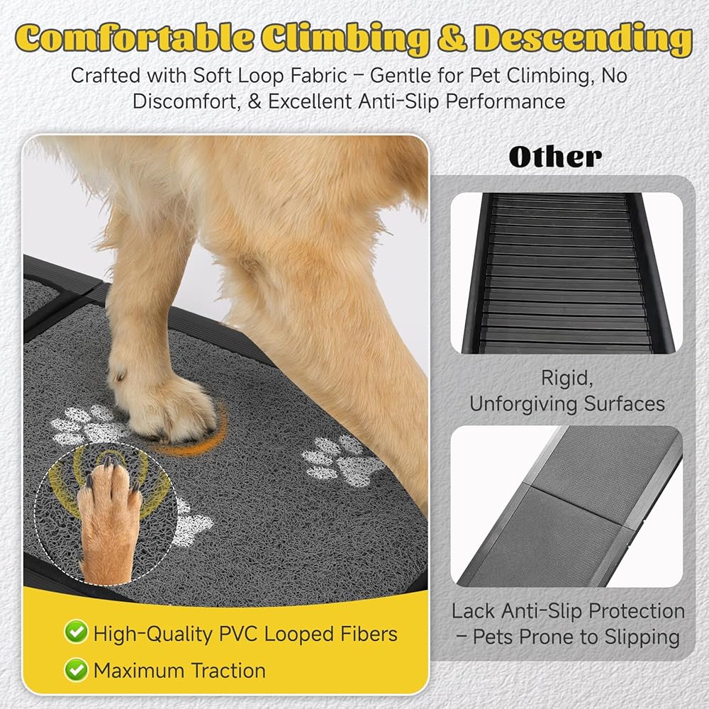 منحدر مضاد للانزلاق وواقي للكلاب - يتميز منحدر الحيوانات الأليفة للكلاب الكبيرة بسجادة قماشية عالية الجر مع قبضة نسيج تشبه الليفة، ويوفر هذا المنحدر قوة جر فائقة. السجاد المضاد للانزلاق يمتص الصدمات لتخفيف الضغط على أقدام ومفاصل حيوانك الأليف، مما يقلل من خطر ألم العضلات وتوتر المفاصل. يحتوي الجزء العلوي من كل خطوة على سطح يشبه المطاط مضاد للانزلاق لضمان ثبات القدم في أي حالة جوية