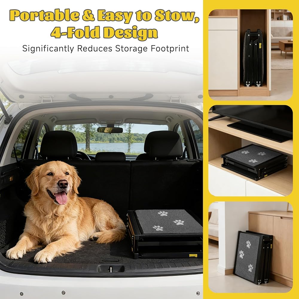 محمول للغاية وقابل للطي رباعي - على عكس المنحدرات الضخمة، يتحول التصميم ذو الأربعة طيات إلى حجم صغير يبلغ 17.5 × 17 × 5.5 بوصة فقط، ومن السهل تخزينه في السيارات أو تحت الأسرة أو بجانب الأرائك، مما يجعله مثاليًا للتخزين والنقل. سواء كانت رحلة على الطريق أو الاستخدام اليومي، فإن هذا المنحدر يلبي بسهولة جميع احتياجات كلبك للوصول إلى المركبات والأماكن المرتفعة