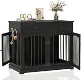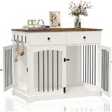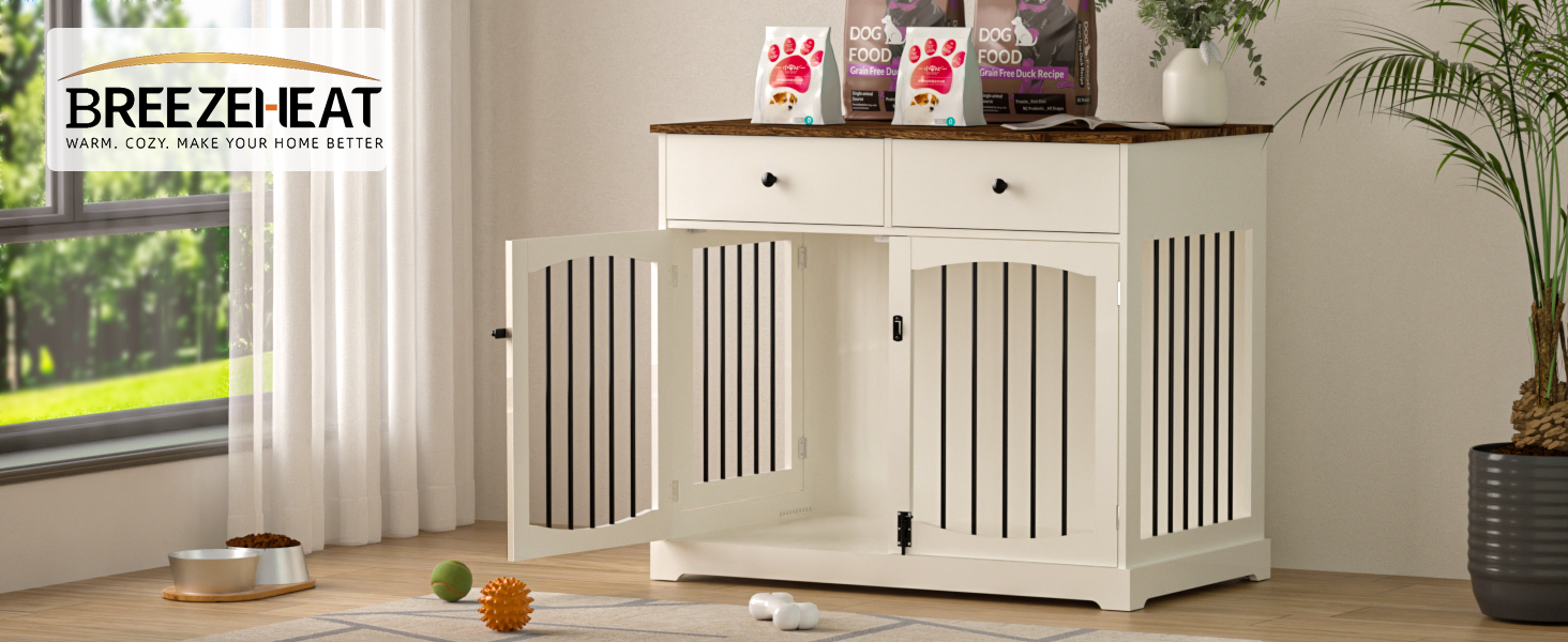BREEZEHEAT أثاث قفص للكلاب مقاس 40 بوصة بيت مزرعة للكلاب مع قفص خشبي للحيوانات الأليفة بطاولة بنهاية الأدراج، تصميم باب مزدوج، بيت كلب مزخرف داخلي للكلاب الصغيرة والمتوسطة والكبيرة، أبيض