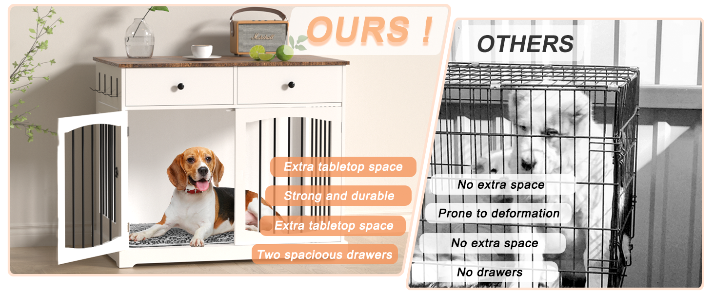 مساحات تخزين إضافية: يتميز قفص الكلاب هذا بجزء علوي واسع وقوي يدعم ما يصل إلى 150-200 رطل، وهو مثالي لعرض ديكور المنزل مثل النباتات والصور. ستجد أدناه درجين كبيرين مثاليين لتخزين طعام الكلاب وألعابها والوجبات الخفيفة. بالإضافة إلى ذلك، فإن الخطافات الجانبية المضافة رائعة لتعليق المقاود وغيرها من الضروريات