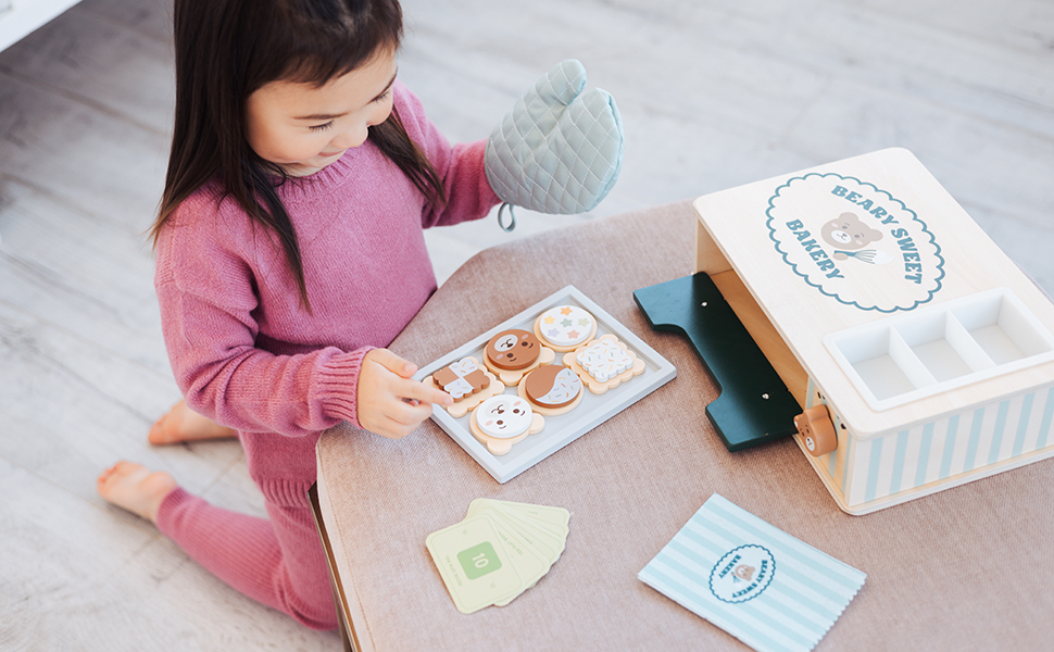 • Interactive pretend baking: Toddlers can “bake,” mix, decorate, and sell their cookies, learning sequencing and communication while improving hand coordination and imagination. Perfect for family play or independent exploration.