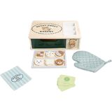 • 25-piece wooden bakery playset: Includes a wooden oven with a clicking dial, baking tray, 6 cookies, 6 interchangeable icings, soft oven mitt, a bakery treat bag, and 9 play bucks for a realistic bakery experience. Encourages role play, storytelling, and fine motor skill development.