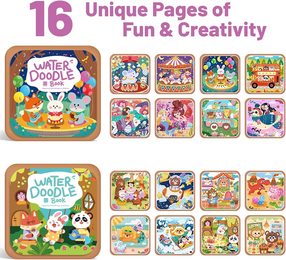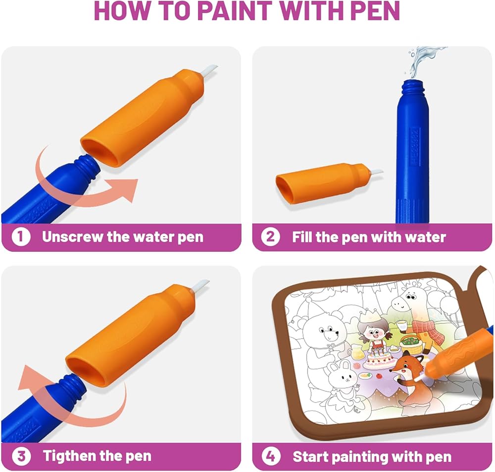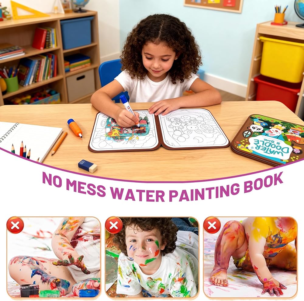【Kid-Safe & Travel-Ready Design】Featuring chunky, refillable water brushes made for small hands, our mess-free painting set is completely non-toxic and washable. Colors disappear from clothes and furniture, making it ideal for home, travel, or classroom use.