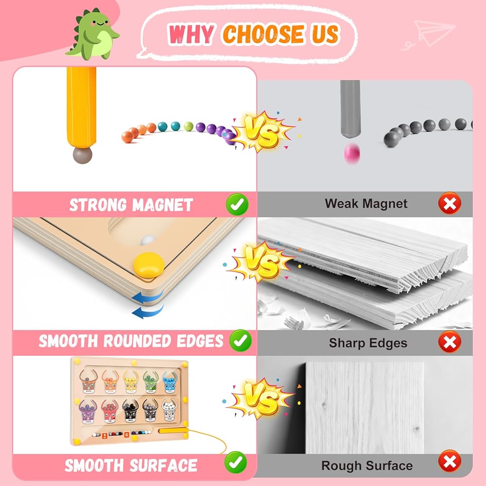🌈[تصميم آمن وصديق للأطفال]: الألعاب الحسية ذات المهارات الحركية الدقيقة مصنوعة من الخشب الطبيعي السميك مع طلاء غير سام. تضمن حوافها المستديرة وسطحها الأكريليكي الناعم عدم تعرض الأطفال للخدش. المتاهة المغناطيسية مغطاة بلوحة أكريليك شفافة، ومثبتة بشكل آمن في مكانها بستة دبابيس ثابتة لمنع سقوط الخرز. يوفر تصميمها الهيكلي القوي والآمن رفقة دائمة مع نمو الأطفال وتعلمهم.