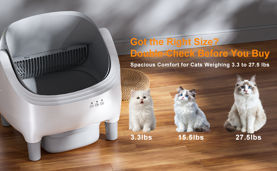 سعة كبيرة جدًا 76 لترًا: حوض الفضلات (مناسب لمعظم فضلات القطط)، ودرج النفايات المحكم الغلق بسعة 13 لترًا يمكن أن يدوم من 10 إلى 15 يومًا لقطط واحدة / 5-7 أيام لـ 2-3 قطط. إفراغ أقل تواترا، المزيد من وقت الفراغ!