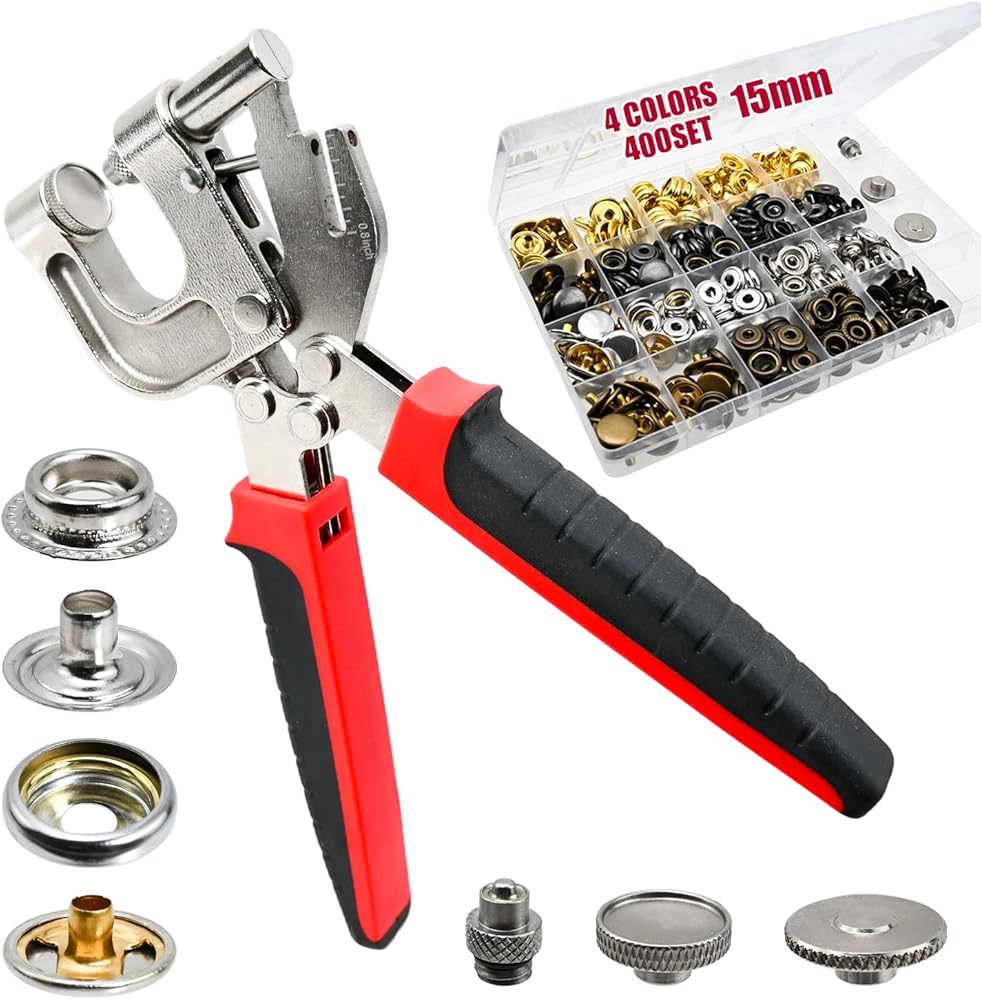 مجموعة أدوات التثبيت بالإطباق، 4 ألوان 400 قطعة من أزرار كبس غطاء القارب مع أداة تثبيت مدمجة، أزرار كبس قماشية 15 مم للجلد والملابس والأعمال اليدوية اليدوية