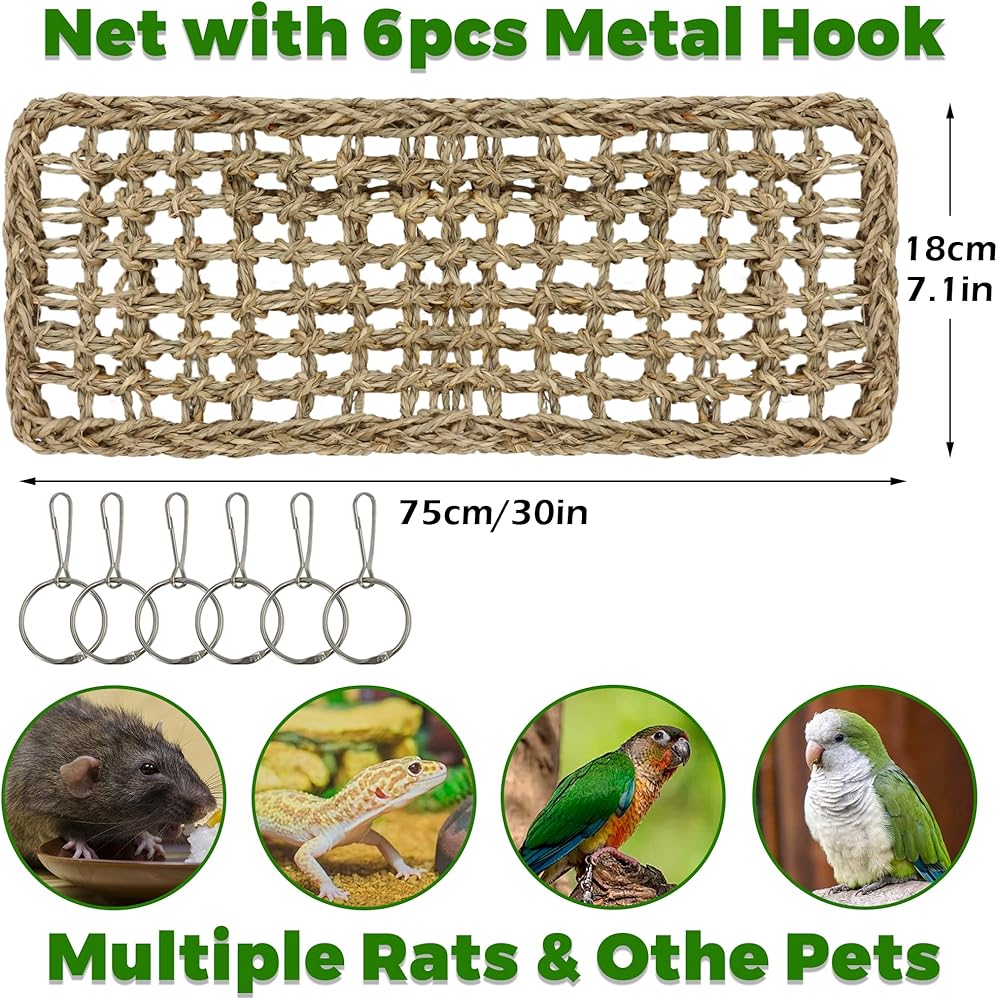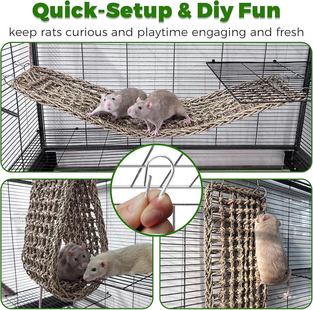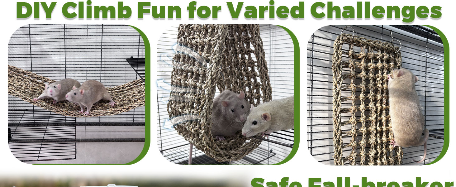 الإعداد السريع ومتعة التسلق بنفسك: تحتوي حصيرة الأعشاب البحرية لتسلق الفئران على 6 خطافات متينة لسهولة إعداد القفص. قم بترتيبها بحرية - أفقيًا أو رأسيًا أو كعش لتحديات التسلق المتنوعة، مما يبقي الفئران فضولية ووقت اللعب ممتعًا ومنتعشًا.