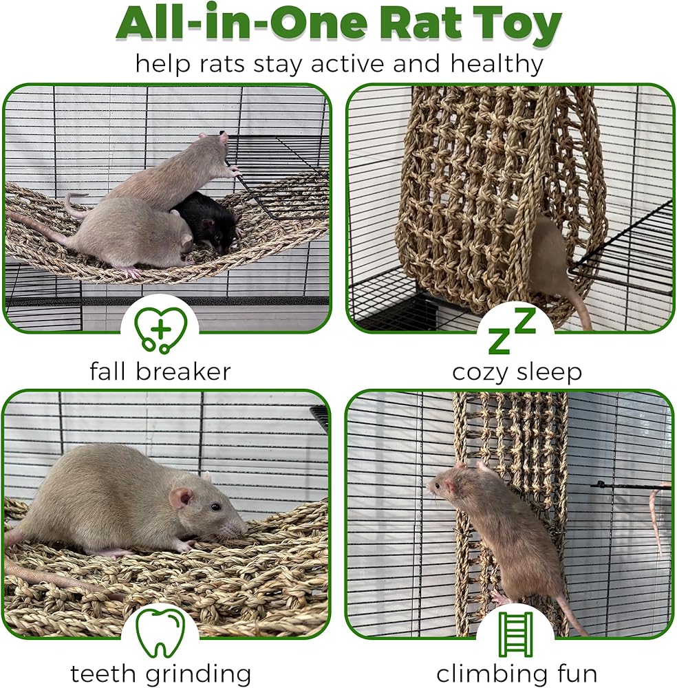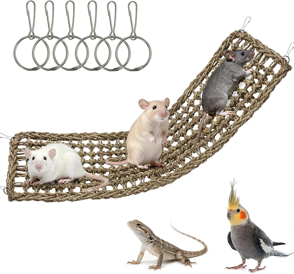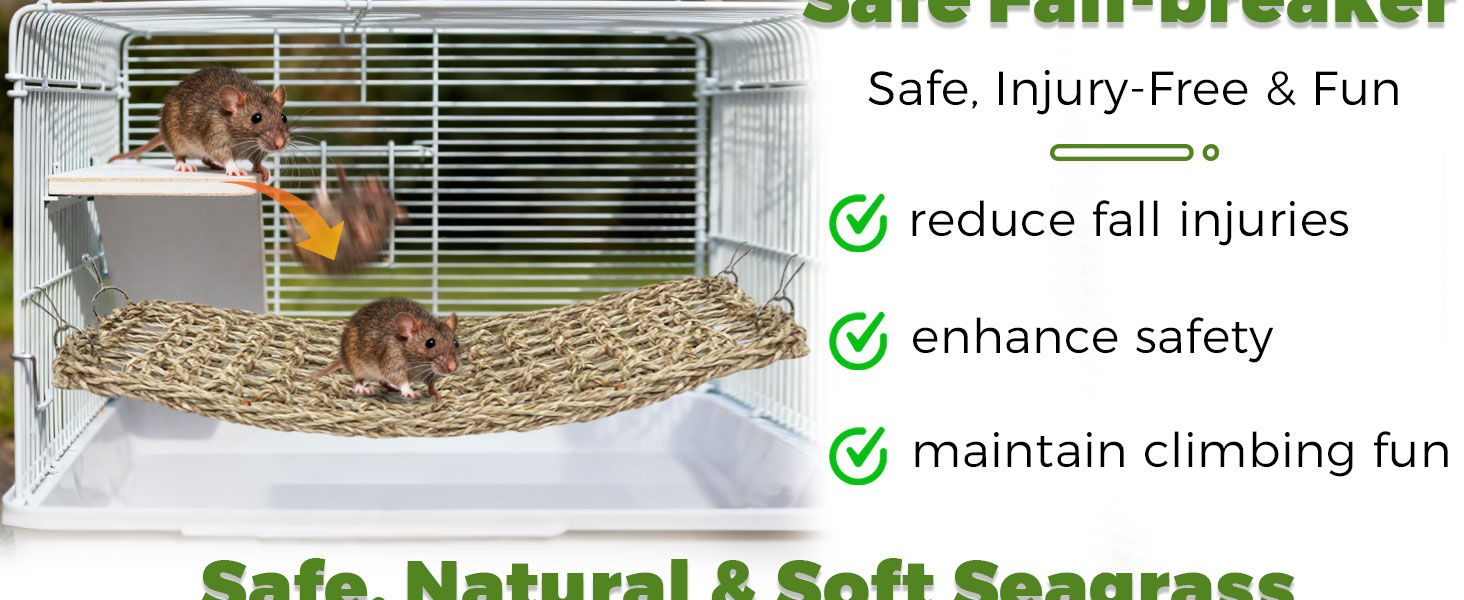 حصيرة واسعة وآمنة: مصممة للأقفاص الكبيرة، ألعاب الفئران الأليفة بطول 30 بوصة وعرض 7.1 بوصة للفئران الأليفة وحصيرة الأعشاب البحرية المتسلقة للفئران توفر مساحة واسعة لفئران أو أكثر، كما أنها مناسبة أيضًا للببغاوات والسحالي والحيوانات الأليفة الصغيرة الأخرى.