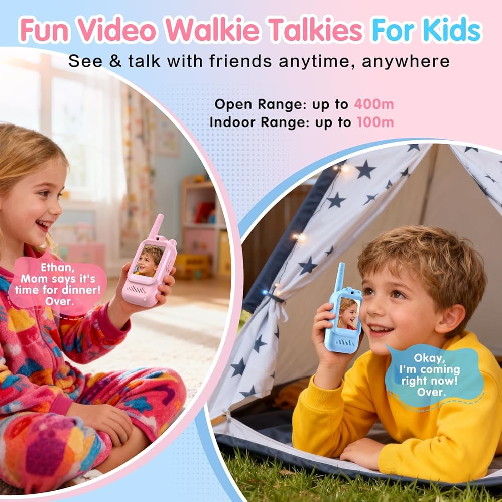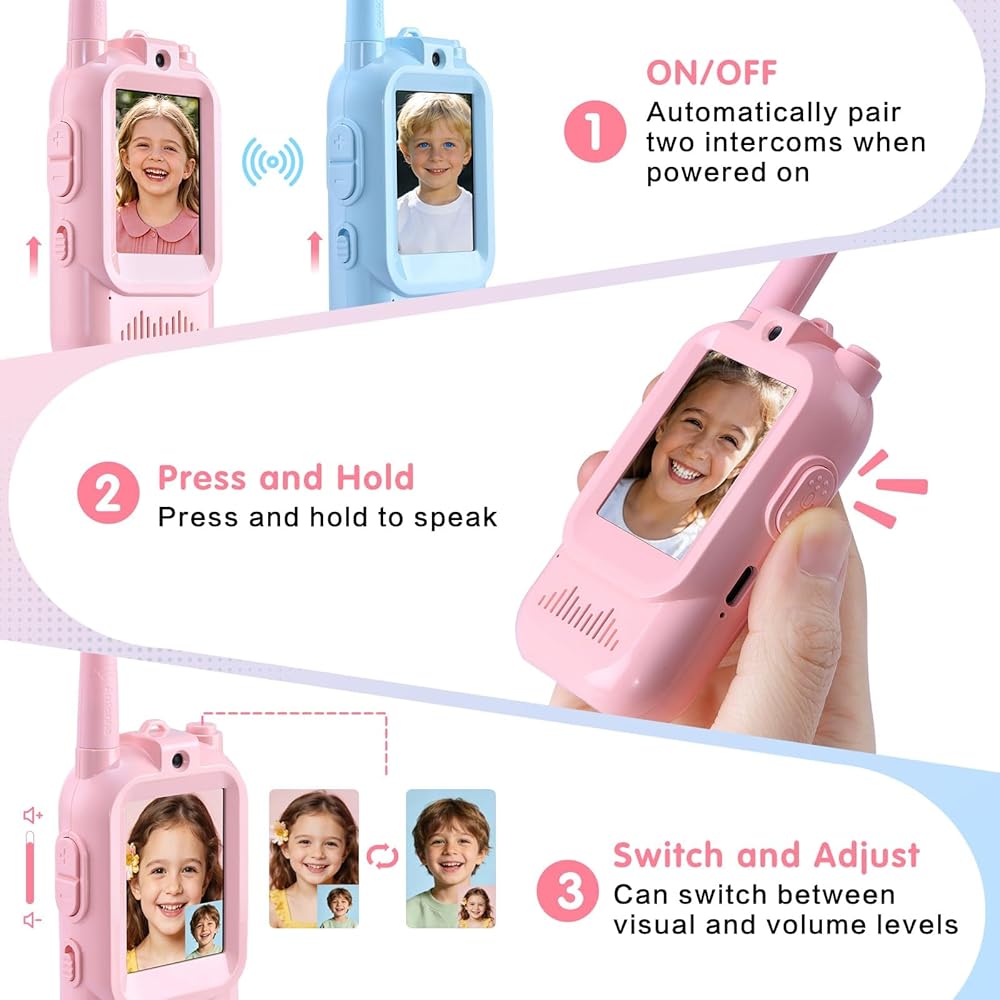 جهاز اتصال لاسلكي للفيديو، مجموعتان من أجهزة الاتصال اللاسلكي القابلة لإعادة الشحن، محول صوت، نطاق اتصالات 1000 قدم، ترفيه داخلي، التخييم، السفر، هدية عيد ميلاد (أزرق/وردي)
