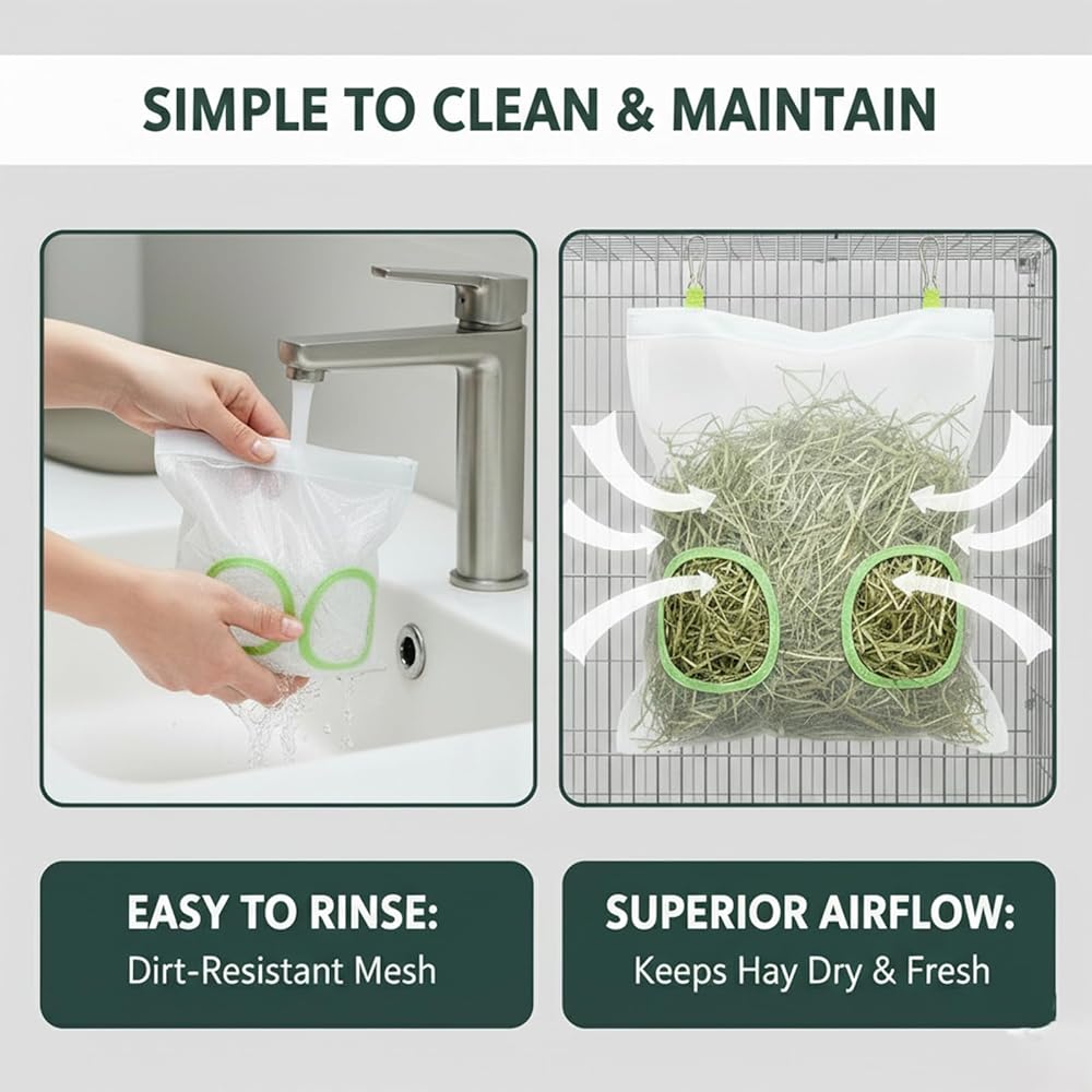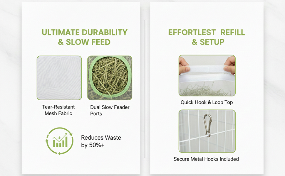 • تصميم نظيف ومريح وسهل الملء: تضمن الشبكة عالية التهوية تهوية فائقة، مما يحافظ على جفاف القش وطازجًا. المادة المقاومة للأوساخ سهلة التنظيف. تتميز بفتحة علوية مريحة مزودة بخطاف وحلقة، مما يسمح بإعادة التعبئة السريعة بيد واحدة دون فوضى أو ضجيج.
