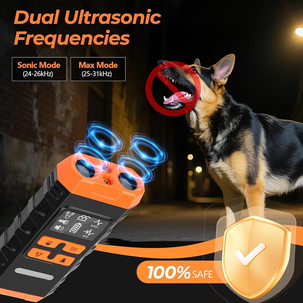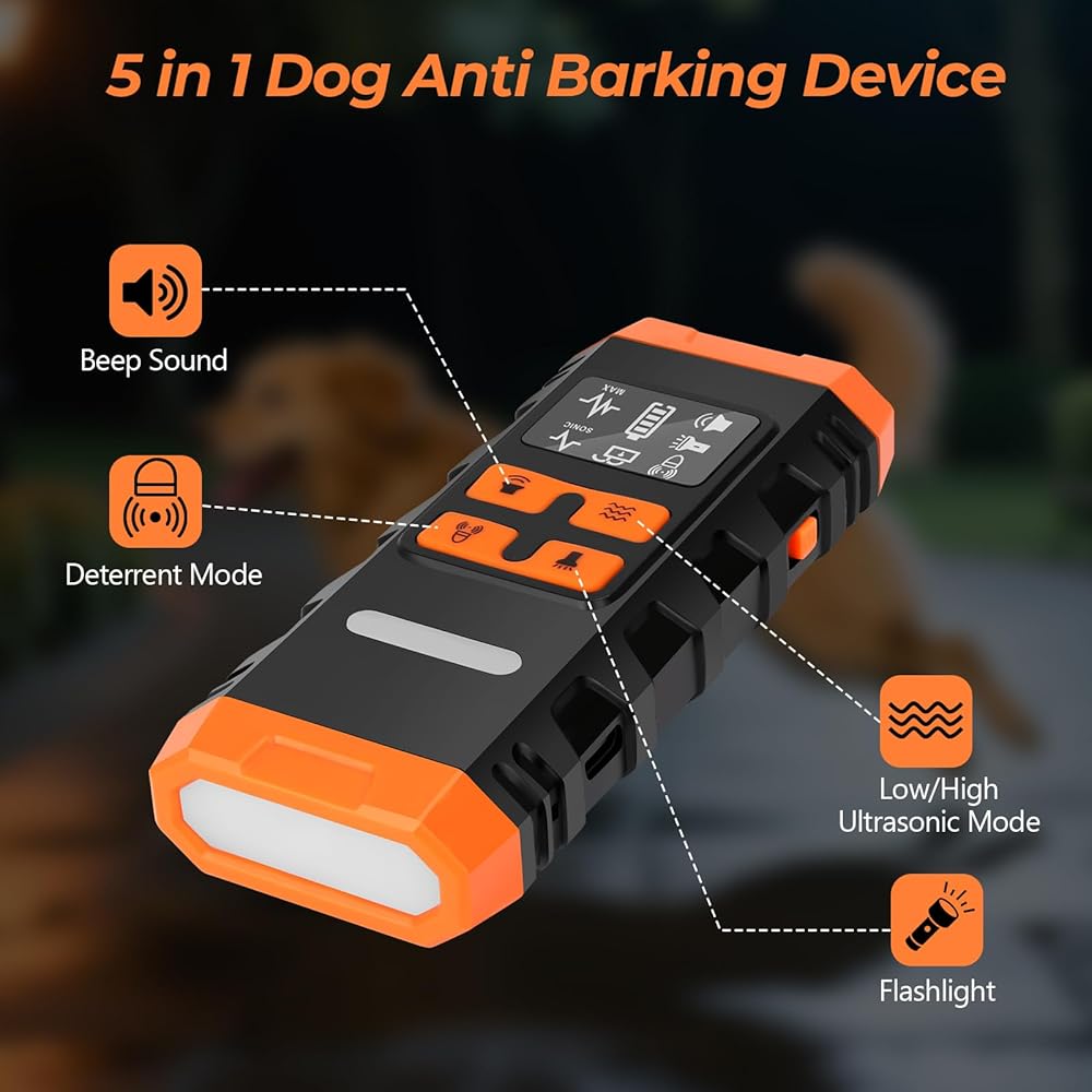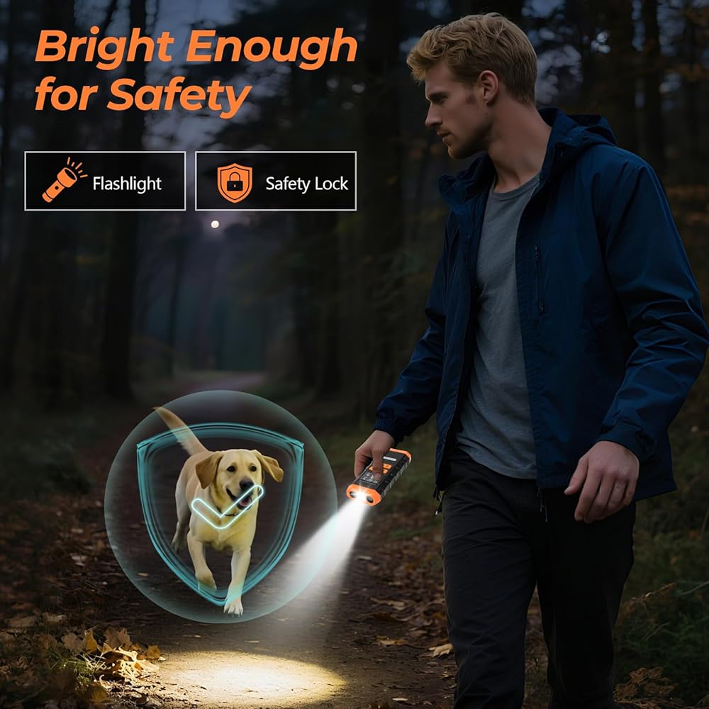 • جهاز مضاد للنباح: يوفر جهاز منع نباح الكلاب هذا تشغيلًا بزر واحد ونهجًا لطيفًا بدون صدمات لتصحيح السلوك. بديل آمن وخالي من الإجهاد لأطواق الصدمات - رائع للكلاب الصغيرة والمتوسطة والكبيرة. يحتوي جهاز مكافحة نباح الكلاب على مصابيح LED مدمجة، مما يسمح لك بالعرض والتبديل بين الأوضاع بسهولة. يمكن لمصباح LED الساطع أيضًا أن يضيء طريقك لتحسين السلامة عند المشي ليلاً أو التدريب في الهواء الطلق.