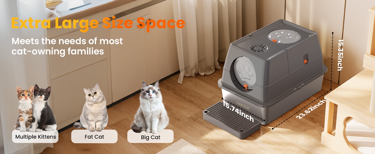 سعة أكبر جدًا: حجم صندوق فضلات القطط الكبير جدًا هو 23.62 بوصة * 15.74 بوصة * 15.35 بوصة، يمكنه استيعاب ما يصل إلى 35 لترًا من فضلات القطط، مما يوفر مساحة كبيرة لقطتك للتحرك، ومناسب للقطط الكبيرة والقطط السمينة وعائلة القطط المتعددة.