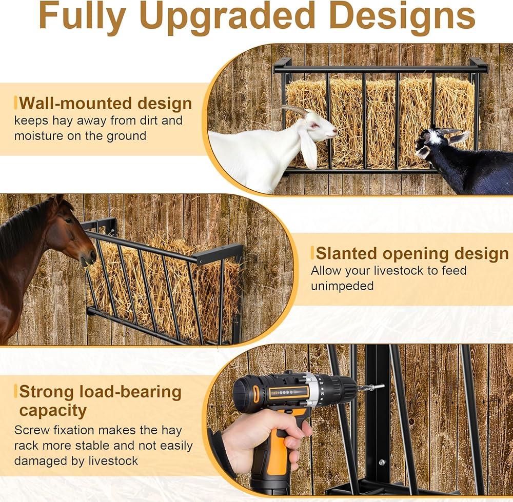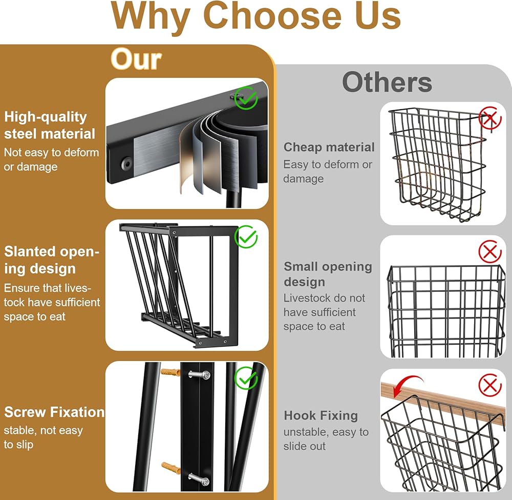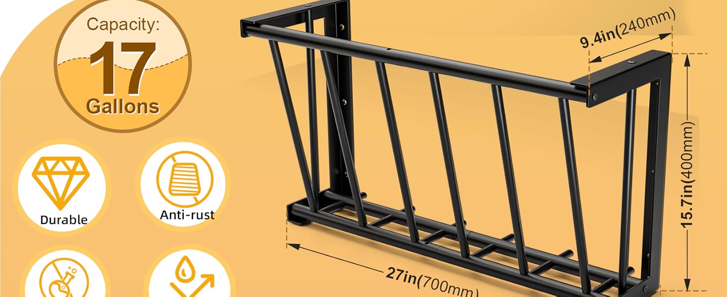 تقليل نفايات القش: تتميز وحدة تغذية قش الماعز هذه بتصميم شرائحي يتحكم في توزيع القش، مما يمنع الماعز أو الخيول من استهلاك الكثير من الطعام في وقت واحد. تحافظ وحدة تغذية الخيول على تغذية حيواناتك الأليفة بطريقة منظمة مع تقليل انسكاب القش وإهداره. يساعد جهاز تغذية الماشية أيضًا في الحفاظ على قلم نظيف عن طريق إبعاد القش عن الأرض.