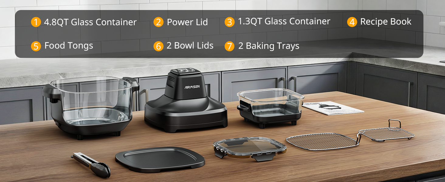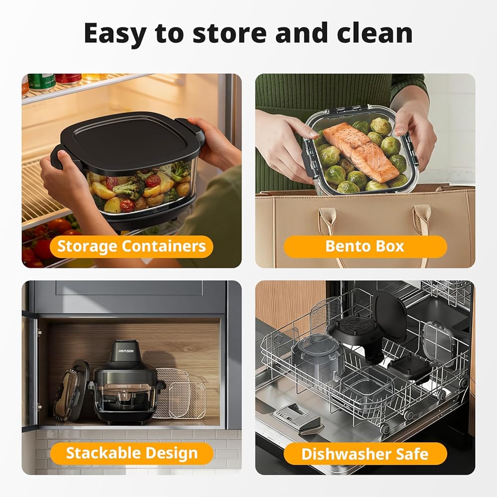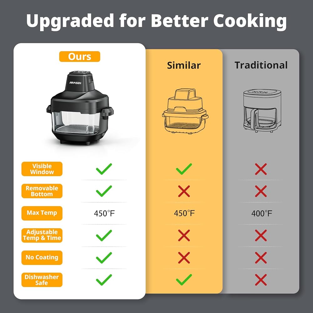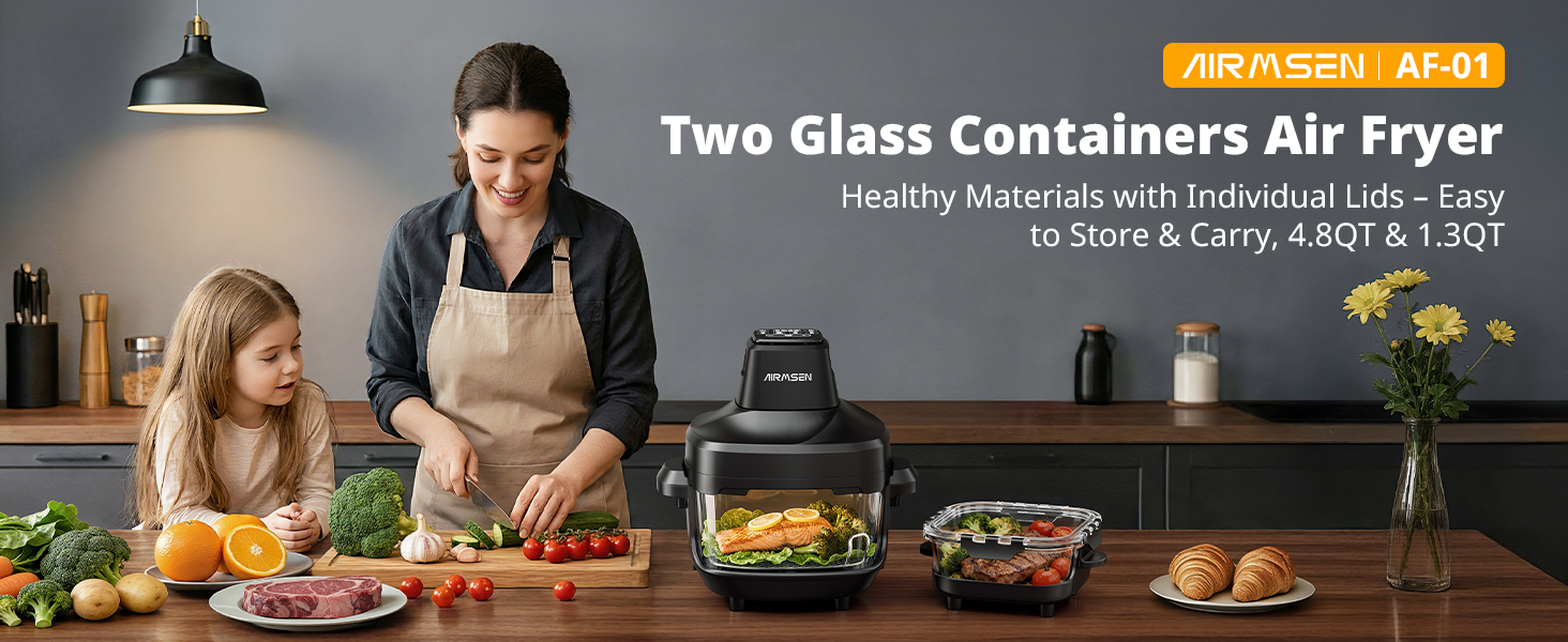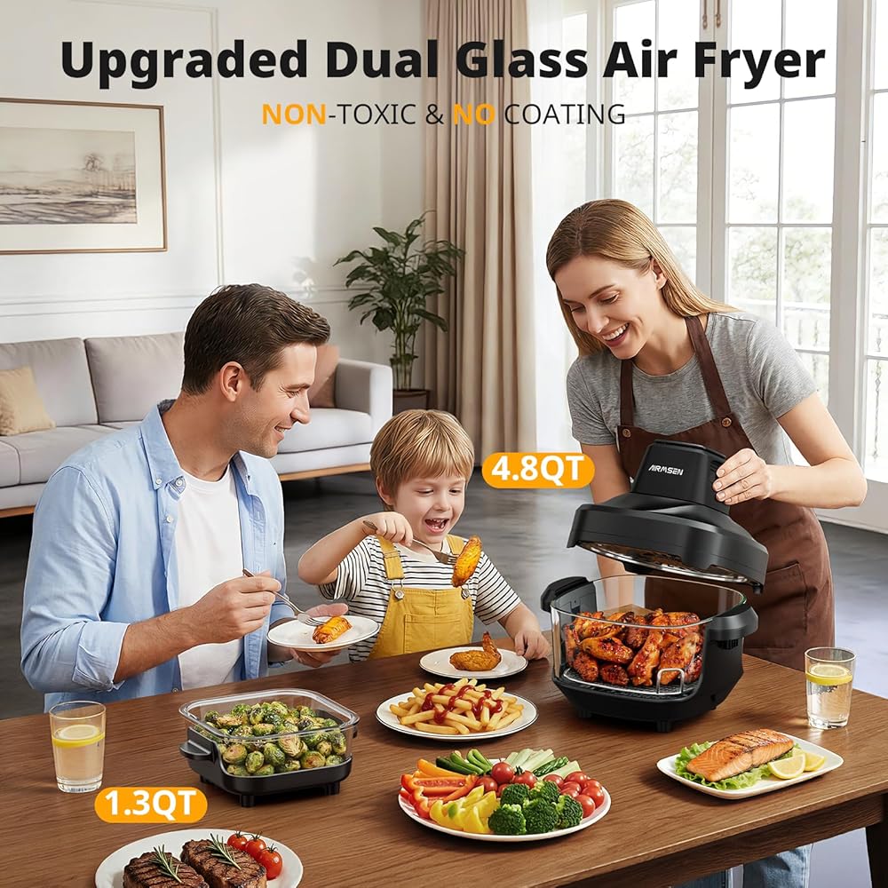 مقلاة هوائية زجاجية قابلة للشرب من AIRMSEN، غير سامة، 4.8QT و1.3QT، 4 إعدادات مسبقة وتحكم يدوي، حرارة دقيقة 140–450 درجة فهرنهايت، زيت أقل بنسبة 95%، إيقاف مؤقت واستئناف تلقائي، آمنة للاستخدام في الميكروويف وغسالة الأطباق
