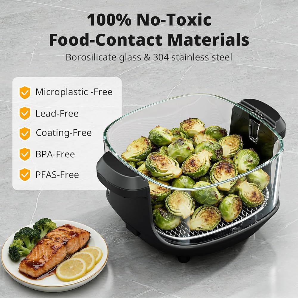غير سامة وخالية من المواد الكيميائية بنسبة 100%: استمتع بتجربة الطبخ النقي مع وعاء زجاجي مقاوم للحرارة العالية وصينية من الفولاذ المقاوم للصدأ 18/8. هذه الوحدة خالية تمامًا من الطلاء، مما يعني عدم وجود PFAS أو PTFE أو المعادن الثقيلة الضارة. يمكنك الحصول على اتصال آمن وصحي مع طعامك في كل مرة.