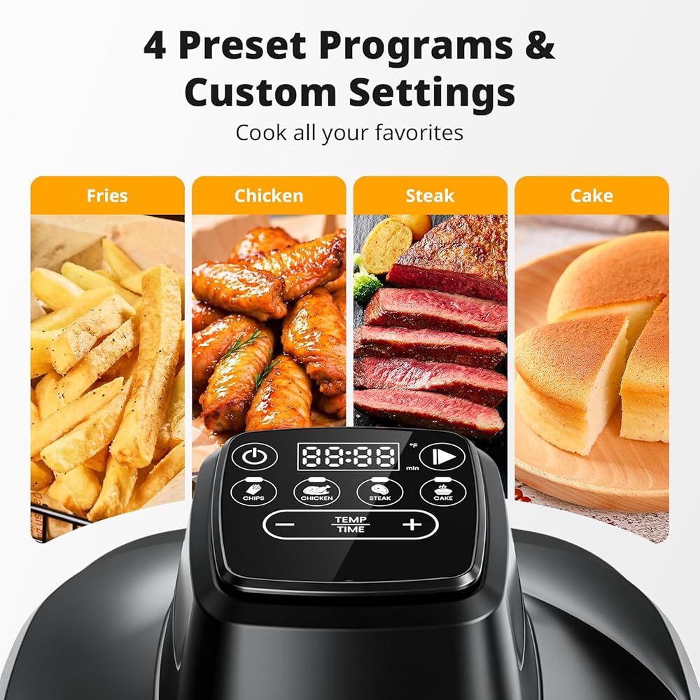 4 في 1 متعددة الاستخدامات مع حرارة عالية تصل إلى 450 درجة فهرنهايت: اختر من بين 4 إعدادات مسبقة سهلة - البطاطس المقلية، وشرائح اللحم، والدجاج الكامل، والمخبوزات - أو قم بتخصيص إعداداتك الخاصة. مع نطاق درجة حرارة واسع يتراوح من 140 إلى 450 درجة فهرنهايت ومؤقت من 1 إلى 60 دقيقة، يمكنك تحقيق المستوى المثالي من القرمشة الذهبية أو العصير اللذيذ.
