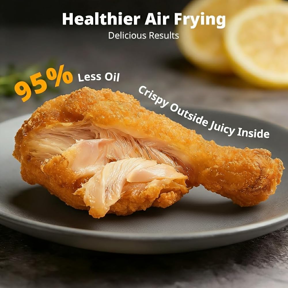 رؤية واضحة تمامًا: توقف عن التخمين! يتيح لك الزجاج الشفاف بزاوية 360 درجة مشاهدة طعامك يتحول إلى اللون البني الذهبي دون فتح الغطاء على الإطلاق. احصل على نتائج مثالية في كل مرة باستخدام نظام التسخين التوربيني بقدرة 1500 واط الذي يقوم بالطهي بالتساوي باستخدام زيت أقل بنسبة 95% من القلي التقليدي للحصول على مذاق لذيذ دون الشعور بالذنب.
