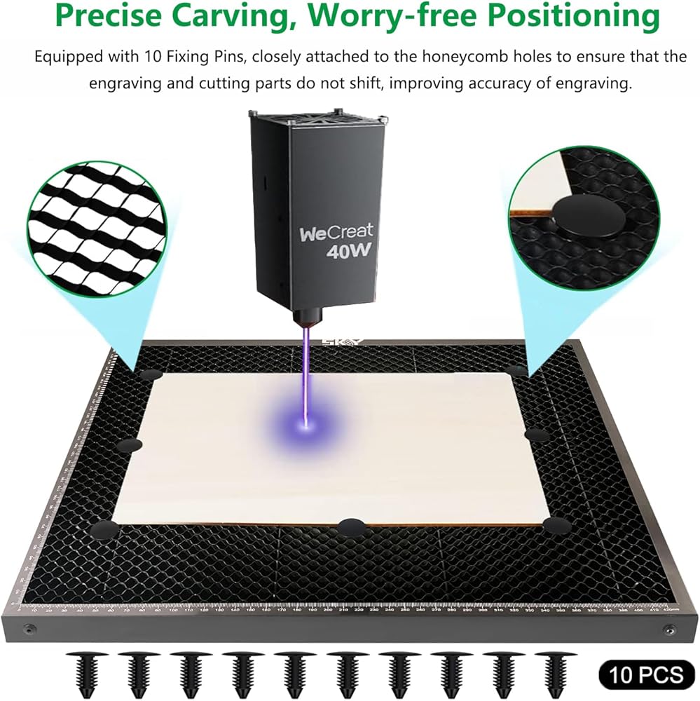 【Measuring Ruler& Fixing Pins】 Honeycomb laser bed X-axis and Y-axis contain precise scale lines to form a right-angle measuring ruler, which is convenient for you to measure the size of cutting objects quickly. come with 10 fixing pins in the packaging for easy fixation during engraving.