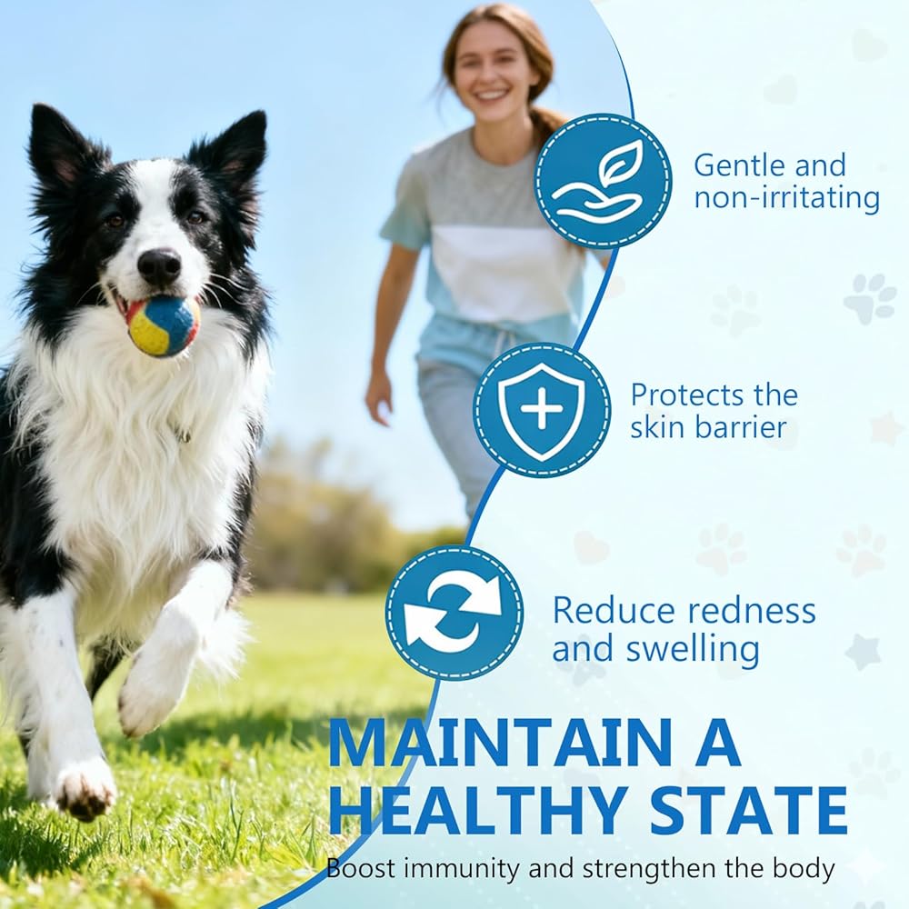 تجديد الجلد والفراء: بالإضافة إلى الراحة البسيطة، تساعد تركيبتنا في استعادة الحاجز الطبيعي للبشرة. يساعد على تقليل الروائح الكريهة "الخميرة" ويدعم طبقة لامعة وصحية، مما يحافظ على راحة كلبك من الأذنين إلى القدمين.