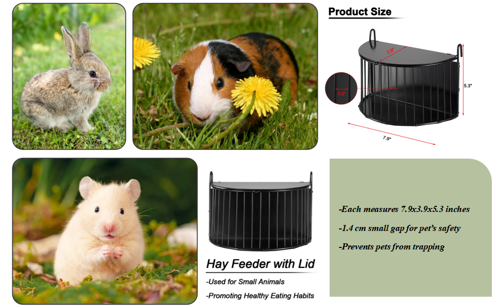 • رف القش الفاخر للأرانب: مصنوع من معدن عالي التحمل، مع طبقة واقية على السطح، وحدة تغذية الأرانب هذه تدوم طويلاً ويمكنها تحمل المضغ اليومي للحيوانات الأليفة، وتجنب الاستبدالات المتكررة. يمنع تصميم الغطاء العلوي الصلب الحيوانات الأليفة من القفز إلى قفص القش والتصاق أقدامها.