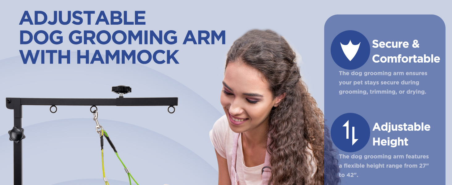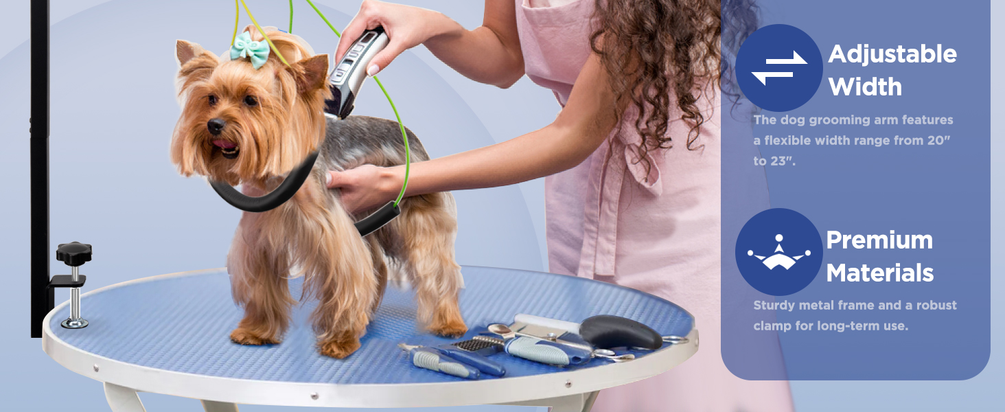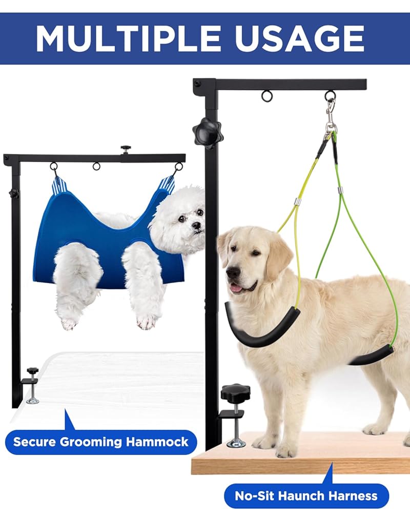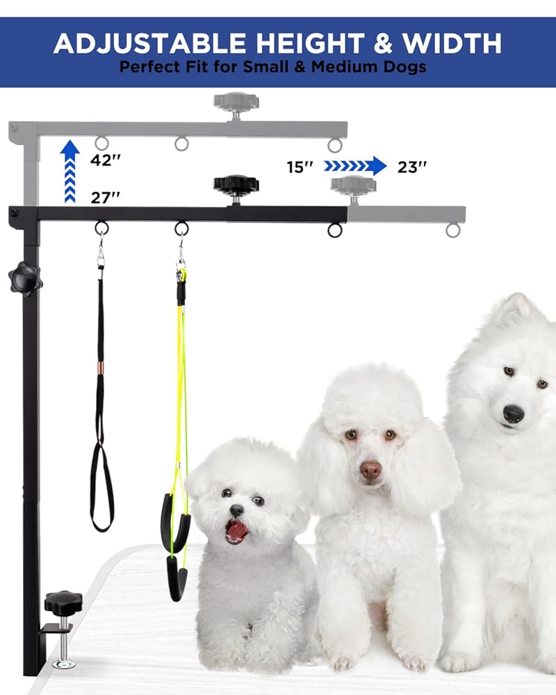 ذراع العناية بالكلاب قابل للتمديد مع أرجوحة، ارتفاع قابل للتعديل 27 بوصة - 42 بوصة، عرض قابل للتعديل 20 بوصة - 23 بوصة، ذراع طاولة للعناية بالكلاب مع مشبك وحامل مانع للجلوس، شديد التحمل للكلاب الصغيرة والمتوسطة